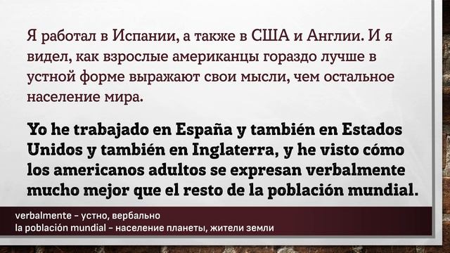 Урок основан на эпизоде подкаста взятом на сайте https://www.bbvaaprendemosjuntos.com/es Полная ссылка на эпизод подкаста: https://www.youtube.com/watch?v=n6ke5YFrbpQ Данный материал предназначен исключительно в образовательных целях. Данный материал частично был синтезирован с помощью искусственного интелекта. Цель – заставить мышление учащегося формировать фразы, части фраз, на испанском языке. Каждая фраза повторяется три раза. Повторения происходит не подряд, а с некоторым "смещением", заставляя всё время мысленно переключаться на другую фразу. Пауза между фразами служит для того, чтобы вспомнить хотя бы одно слово, часть фразы или всю фразу на испанском языке. Чем длиннее фраза на русском языке – тем длиннее пауза до фразы на испанском языке. Достаточно, если человек самостоятельно начинает формировать хотя бы кусочки фразы, некоторые слова. Данный вид упражнений не стоит делать более одного часа за один раз. Достаточно прослушивать такие упражнения в фоновом режиме: замимаясь домашними делами, находясь в дороге или на прогулке, занимаясь спортом. Использйте для обучения только тот материал, который Вы понимаете на 90%-95%! Иностранные языки не учат. К иностранным языкам привыкают. Чтобы выучить любой язык необходимо «провести с ним» 10 000 часов. #испанский #испания #слова #фразы #aprender #español #españa #español #испанскийязык #испанскийбесплатно #испанскийэффективно #учимиспанский #испанскийучить #shadowing #ShadowingTechnique #Lerntechnik #произношение #грамматика #subjuntiv #expresiones #shadowingmethode #эффективно #españolonline #españoloffline #aprenderespanolonline #pimsleur #paulpimsleur Слова и выражения из этой части подкаста: ================================================ además - кроме того, помимо, наряду castellano - Испанский литературный язык comunicar - общаться, уведомлять, поделиться мыслями decidir - выбрать, решиться, принять решение el estrabismo - косоглазие el parquin - (от англ. Parking) парковка, автостоянка enseñanza pública - государственное образование enseñar - научить, показывать, объяснять faltas de ortografía - орфографические ошибки, опечатки insistir - настаивать, утверждать, подчёркивать invertir - инвестировать, вкладывать la isla - остров la población mundial - население планеты, жители земли los subtítulos - субтитры mandar - посылать, командовать, приказывать moto de montaña - мототриал, горный мотоцикл operar - оперировать por esa razón - по этой причине que (subj.) abras los ojos - (дословно) открыл БЫ ты глаза trece - тринадцать verbalmente - устно, вербально