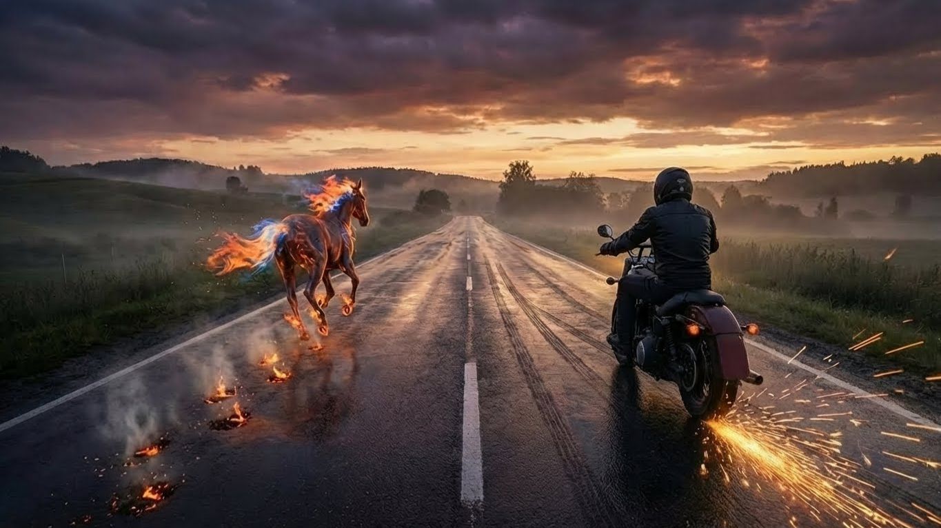 2026 год Коня-Огня по восточному календарю. Мотоциклист и мистический Конь-Огонь идут навстречу рассвету по земле, по памяти, сквозь индустриальные руины и тишину. Каждая сцена — символ. Каждое ускорение — решение. 🎬 Генеративная постановка: AI-сцены (Veo3, Wan2.2), 16:9, 8 секунд каждая 🔥 Визуальный стиль: кинематографичный реализм с элементами мифа [Куплет 1] Кто молчал в ответ, МЕдлил в ночь уйти, Гнал дыхание дней, Разлукой робел, печалился. [Припев] Скрипнул ставень — пёс ЗАлаял, Крикнул ворон у ворот. В путь от края и до края Конь-о-гонь поводья рвёт! (рвёт!) [Куплет 2] Бес в ребро мне, ветер в спину — Что гуляку в поле ждёт? Может быть, сыра могила, Может — слава и почёт. Только мачеха-судьбина Правду знает наперёд. Как следы в рассвет остынут, Под крыло сынка возьмёт. [Припев] Скрипнул ставень — пёс ЗАлаял, Крикнул ворон у ворот. В путь от края и до края Конь-о-гонь поводья рвёт! (рвёт!) [Аутро] В путь от края и до края Конь-огонь поводья рвёт! #КОНЬОГОНЬ