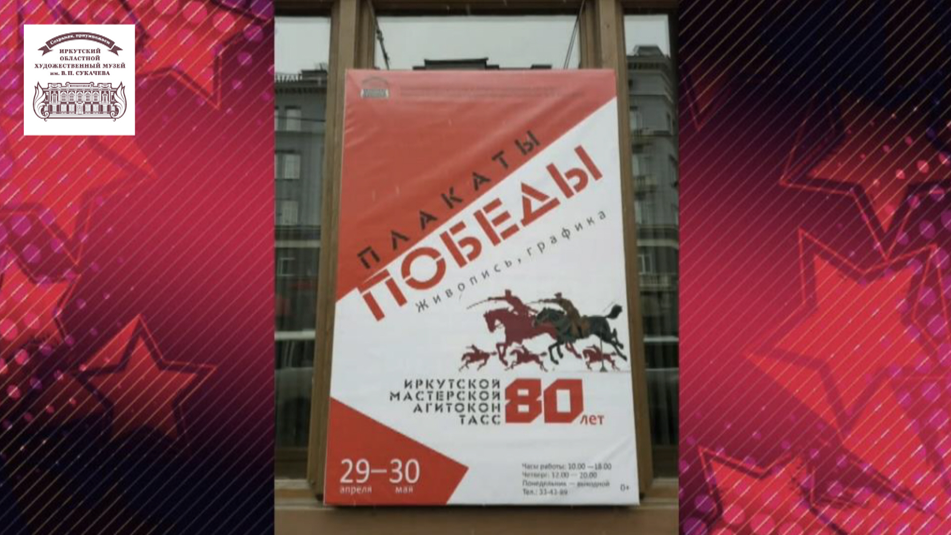 29 апреля 2021 года в Иркутске в Галерее сибирского искусства (ул. Карла Маркса, 23) открылась выставка «Плакат Победы. 80 лет Иркутской мастерской Окон ТАСС». Экспозиция, посвященная 76 годовщине Победы в Великой Отечественной войне, составлена из лучших агитационных плакатов из собрания Иркутского художественного музея и призвана отразить самоотверженный труд художников в военное время. «Окна ТАСС» (Телеграфное агентство Советского Союза) — серия агитационных плакатов, выпускавшаяся для поднятия боевого духа Красной Армии и гражданского населения СССР в период Великой Отечественной войны 1941–1945 годов. В сентябре 1941 года мастерская «Окон ТАСС» была организована в Иркутске. Ее возглавил эвакуированный из столицы живописец, график и театральный художник Давид Штеренберг. Плакаты создавались в тяжелейших условиях, при отсутствии необходимых материалов, в неблагоустроенных холодных помещениях, при этом художники работали в несколько смен. В боевую группу мастеров изобразительного искусства также включились иркутские поэты, дополняя яркие изображения хлесткими стихами. Плакаты размещались на специальных стендах центральных иркутских улиц, а также тиражировались вручную и распространялись по заводам и предприятиям, где для победы работали все, кто не был на фронте. За четыре года работы мастерской было создано около 800 оригинальных плакатов, распространенных тиражом более 23 тысяч экземпляров. В экспозиции «Плакат Победы. 80 лет Иркутской мастерской Окон ТАСС» представлена часть большой коллекции агитокон, созданных ведущими иркутскими художниками того времени: Владимиром Томиловским, Николаем Шабалиным, Александрой Мадиссон, Степаном Развозжаевым, Марией Гранавцевой, Анваром Закировым, Александром Руденко и др. Выставку дополняют живописные портреты авторов из собрания Иркутского художественного музея.