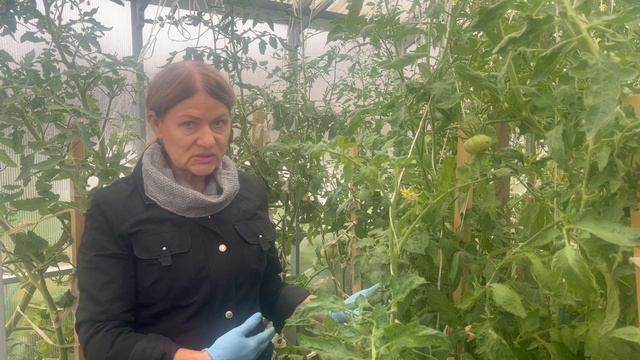 Обзор томатов в теплице 23 августа Лен. обл. Я называю этот год для меня провалом года, томаты в жаркую погоду не завязывали, поэтому плодов мало. Но сейчас , когда испортилась погода, ночью всего 5 градусов, а дневные температуры около 16 градусов, томаты начали завязывать. Конечно они не успеют вырасти. Дверь в теплицу постоянна открыта, 1 раз в неделю поливаем капельно с фитоспоринои для профилактики фитофтора. Пока растения выглядят здоровыми.
