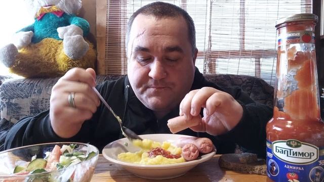 полуленивый мукбанг - салат летний, пюре с сосисками