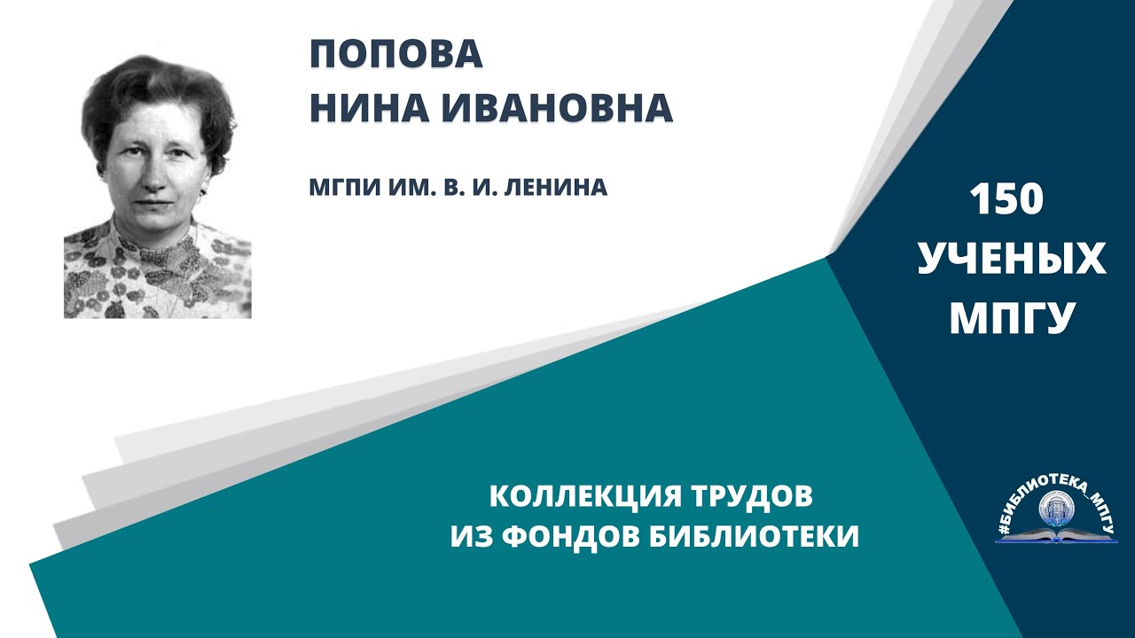 О научной и педагогической деятельности профессора Поповой Н. И. рассказывает доцент Кафедры романских языков имени В. Г. Гака Школьник А. Ф. Создатели проекта: авторы идеи – Лиханова И. В., директор библиотеки МПГУ, Свирина М. Н., заведующий информационно-справочной службой библиотеки МПГУ; подготовка материалов – Капитонова Т. А., главный библиотекарь; текст за кадром – Свирина М. Н., заведующий информационно-справочной службой библиотеки МПГУ; монтаж – Климова А. А., главный библиотекарь. Вопросы о доступности изданий из фонда Библиотеки МПГУ Вы можете направить на почту: lib_ms@mpgu.su . Адреса отделов Библиотеки МПГУ Вы можете посмотреть, перейдя по ссылке: http://mpgu.su/ob-mpgu/struktura/biblioteka/struktura/ #МПГУ #150ЛетМПГУ #ЮбилейМПГУ #Ученые #Попова