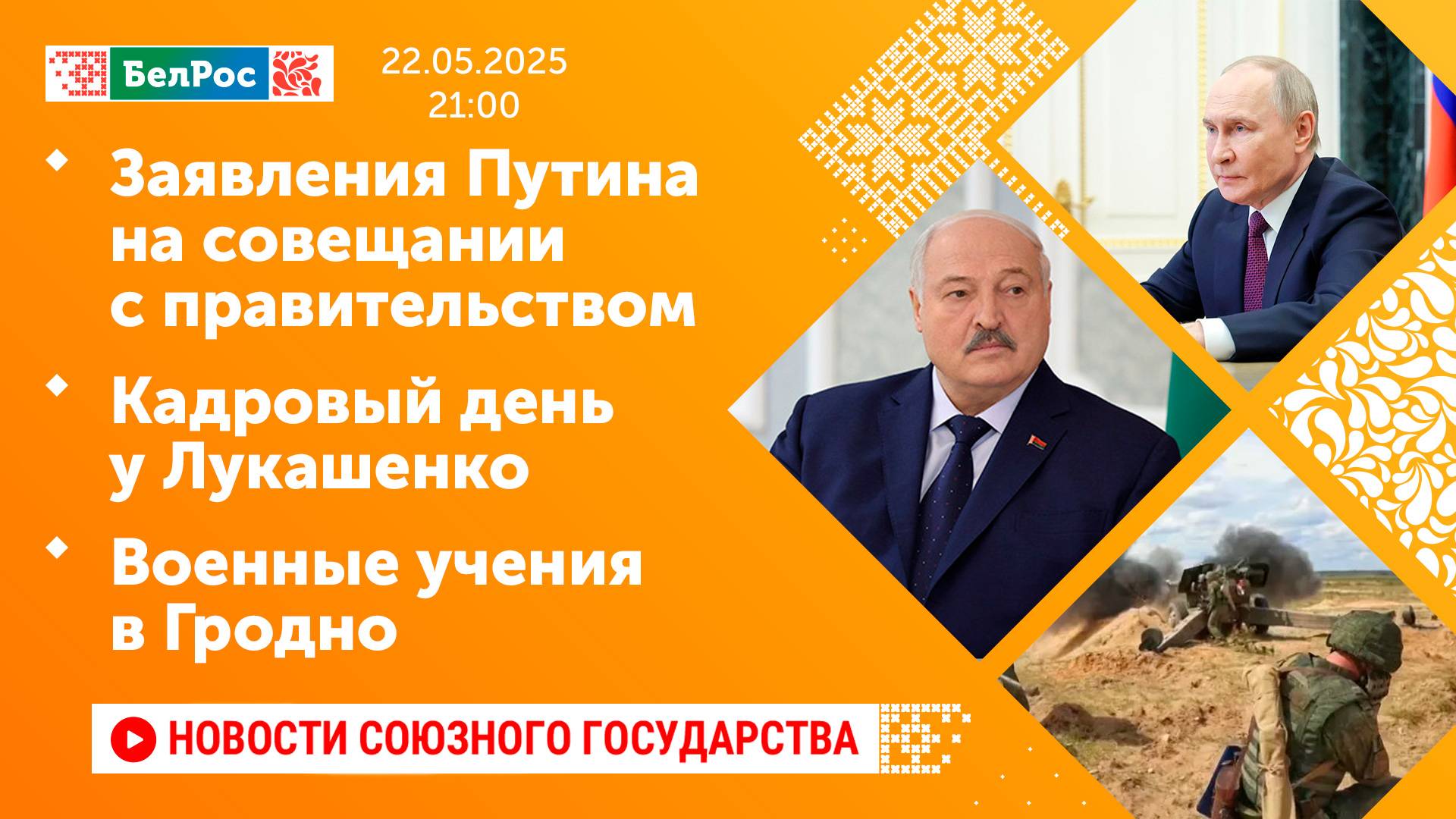 Закадровый текст озвучивает *ИИ Антон* Новости 22.05.2025 на 21:00 - Путин поручил подготовить программу восстановления и развития приграничных регионов. - Александр Лукашенко принял ряд кадровых решений. - Мобильные огневые группы уничтожили дроны ВСУ. - Артиллеристы группировки "Юг" уничтожили гаубицу L-119 и миномомёт ВСУ. - Расчёты гаубиц "Мста-Б" поразили объекты ВСУ на правом берегу Днепра. - В Гродно прошли военные учения. - Российские пилоты выступили на авиакосмической выставке. Смотрите главные новости Союзного государства на телеканале БелРос. Ссылки на наши соц. сети Сайт: http://belros.tv/ Telegram: https://t.me/belrostv Одноклассники: https://ok.ru/group/55657426976918 ВКонтакте: https://vk.com/belrostv TikTok: https://www.tiktok.com/@belros_tv?_t=... RuTube: https://rutube.ru/channel/23501830/ Яндекс. Дзен: https://zen.yandex.ru/belrostvv Наши подкасты на Яндекс. Музыке: https://music.yandex.ru/album/25615251 #главныеновости #новостисегодня #СоюзноеГосударство