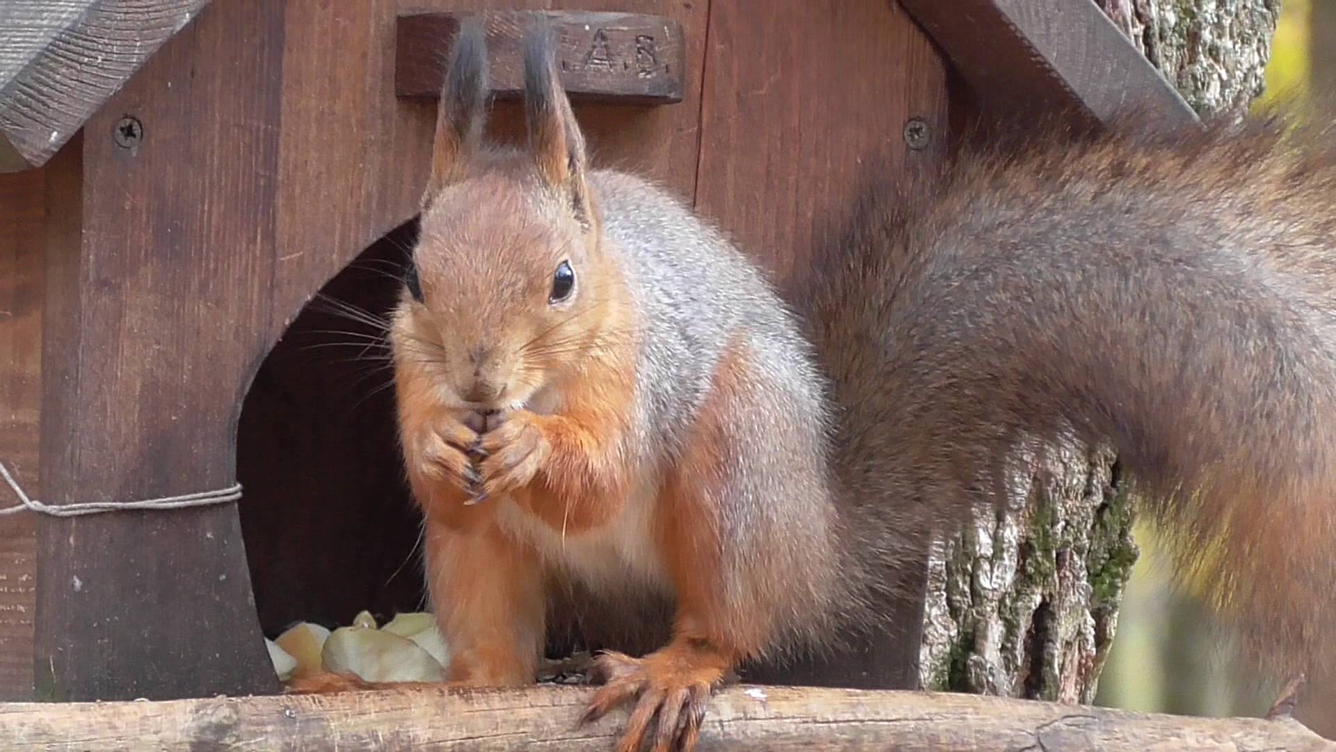 Белка на кормушке, белка кушает