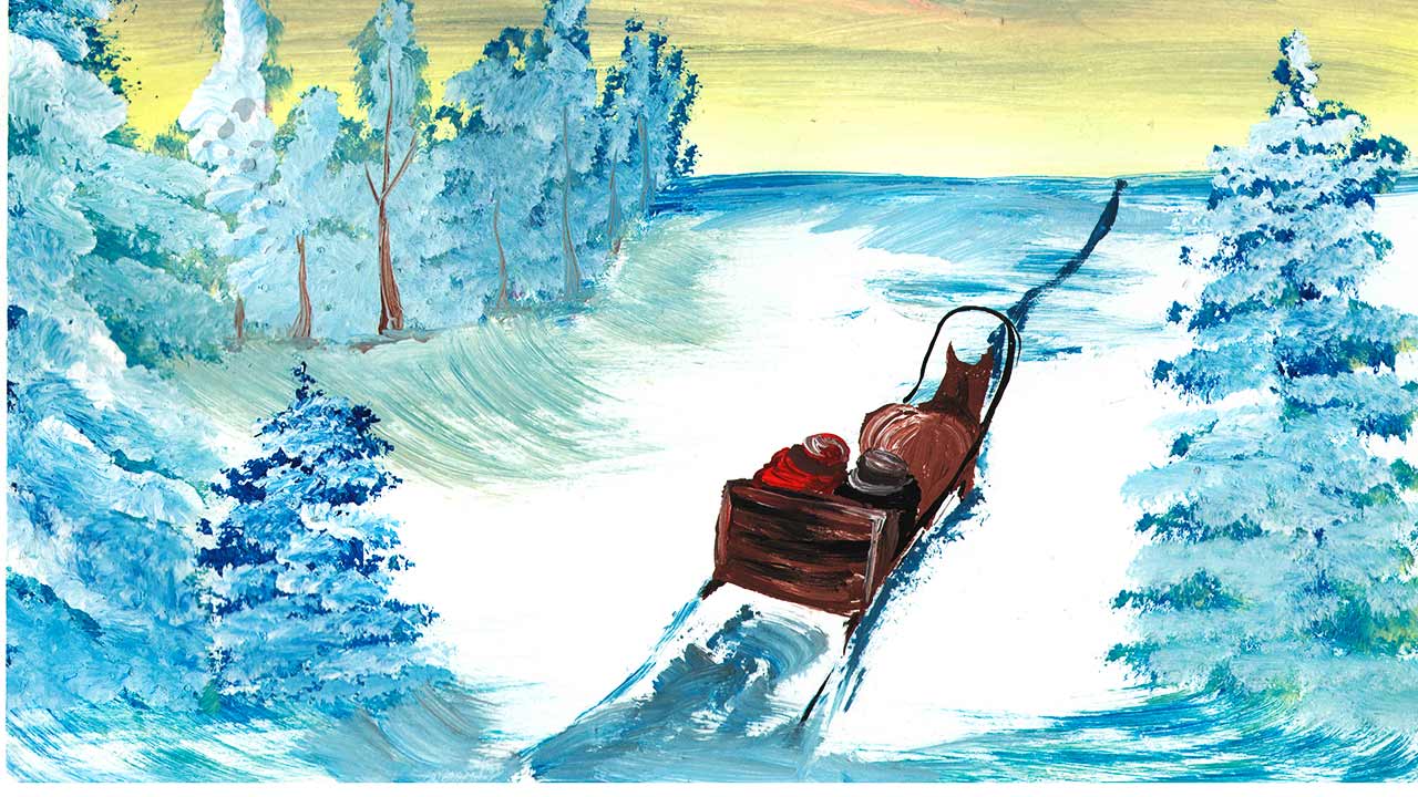 Как нарисовать сани. Рисуем зимний пейзаж. Рисуем лошадь в лесу. Правополушарное рисование. Зима.