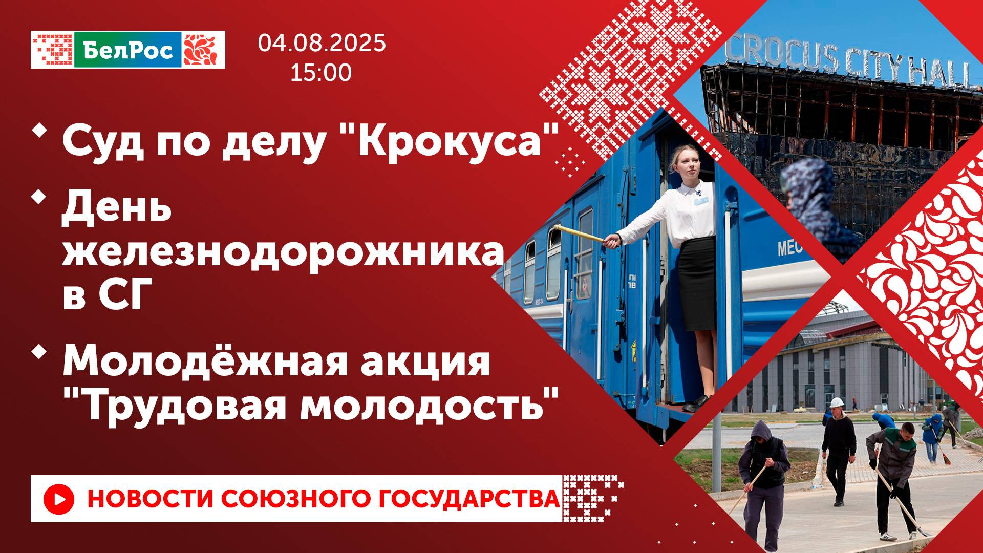 Закадровый текст озвучивает *ИИ Антон* Новости 04.08.2025 на 15:00 - В Москве начался судебный процесс по уголовному делу о теракте в "Крокус Сити Холле". - Сотрудники ФСБ нейтрализовали трех террористов в Кабардино-Балкарии. - Автобус с туристами столкнулся с поездом в Ленинградской области. - Режим ЧС введён в Туапсинском районе Краснодарского края из-за обильных осадков. - День железнодорожника отметили в России и Беларуси. - Состязания санитарных дружин организаций и предприятий прошли в Гродно. - Молодёжная акция "Трудовая молодость" прошла на "Белкоммунмаше". Смотрите главные новости Союзного государства на телеканале БелРос. Ссылки на наши соц. сети Сайт: http://belros.tv/ Telegram: https://t.me/belrostv Одноклассники: https://ok.ru/group/55657426976918 ВКонтакте: https://vk.com/belrostv TikTok: https://www.tiktok.com/@belros_tv?_t=... RuTube: https://rutube.ru/channel/23501830/ Яндекс. Дзен: https://zen.yandex.ru/belrostvv Наши подкасты на Яндекс. Музыке: https://music.yandex.ru/album/25615251 #главныеновости #новостисегодня #СоюзноеГосударство