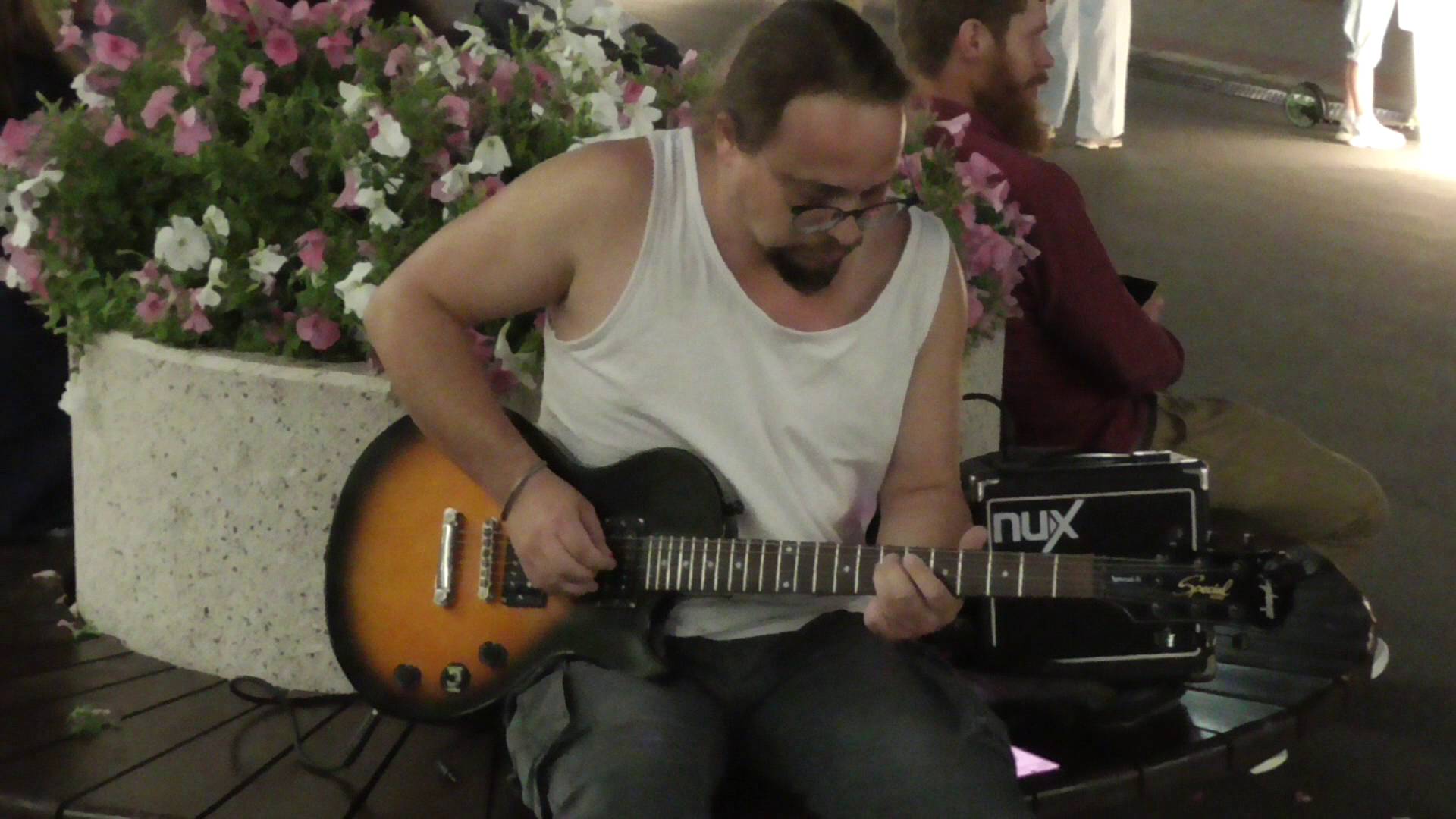 Мужчина гитарист играет на электрогитаре