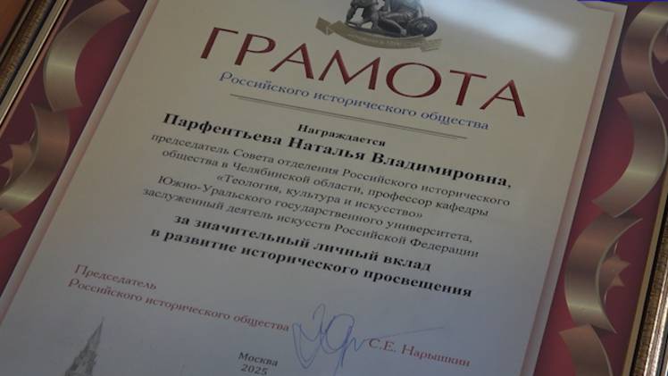 «За значительный личный вклад в развитие исторического просвещения» награждена председатель Совета отделения Российского исторического общества в Челябинской области, Заведующий кафедрой «Теология, культура и искусство» ЮУрГУ Наталья Парфентьева.