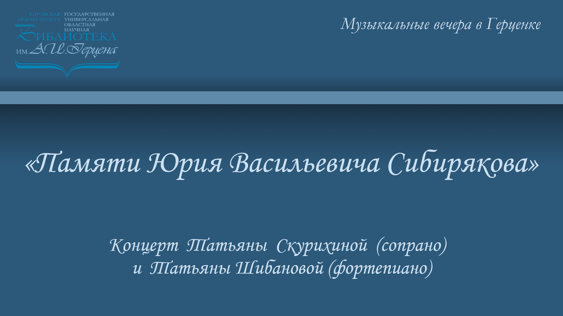 2 февраля в Герценовском (большом) зале в рамках проекта «Музыкальные вечера в Герценке» состоялся концерт памяти выдающегося вятского пианиста и педагога Юрия Васильевича Сибирякова. Дань уважения, любви и благодарности Маэстро отдали его ученицы, а затем и коллеги: лауреат международных конкурсов, заслуженный работник культуры Татьяна Скурихина (сопрано), Татьяна Шибанова (фортепиано) и Лариса Литовская, выступившая ведущей вечера. ата проведения концерта была выбрана неслучайно: именно 2 февраля 2007 года перестало биться сердце прекрасного музыканта и светлого человека Юрия Васильевича Сибирякова, игру которого не раз слышали стены Герценки. Юрий Васильевич выступал сольно, играл в оркестрах, был блистательным концертмейстером, с ним выступали с огромным удовольствием. Более 40 лет он работал в Кировском колледже музыкального искусства им. И. В. Казенина, за это время выпустил более 100 студентов. Он был человеком потрясающего обаяния и искромётного чувства юмора. Программу концерта составили произведения П. И. Чайковского и Э. Грига – любимых композиторов Ю. В. Сибирякова. А некоторые романсы в Герценовском зале позвучали впервые.