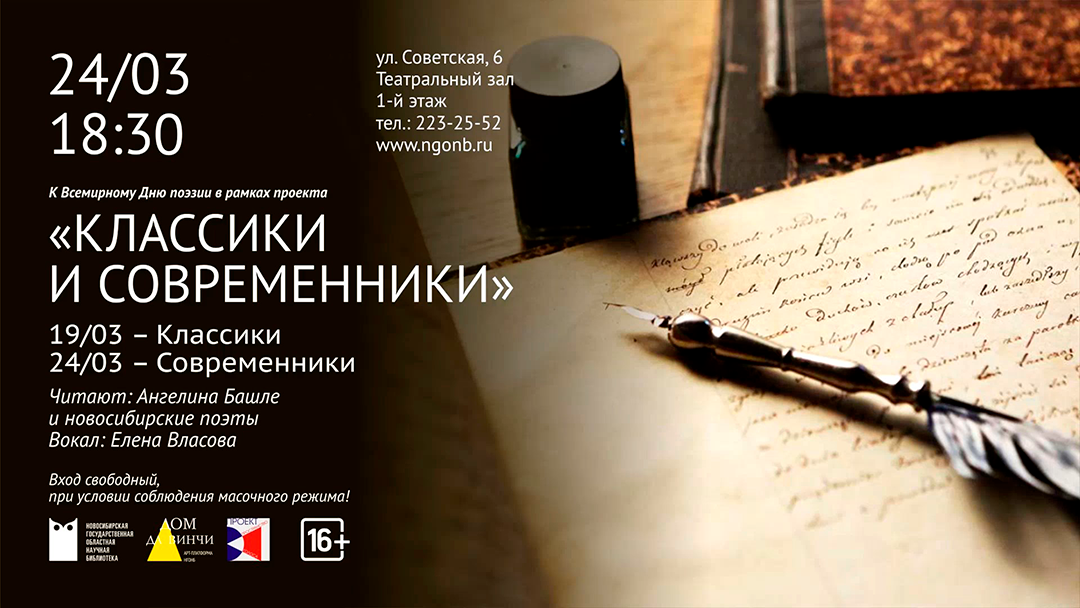 К Всемирному Дню поэзии! В рамках проекта «Классики и Современники», в театральном зале Областной научной библиотеки, Ангелина Башле представит музыкально-поэтическую программу: «Современники». 24 марта 2022 года