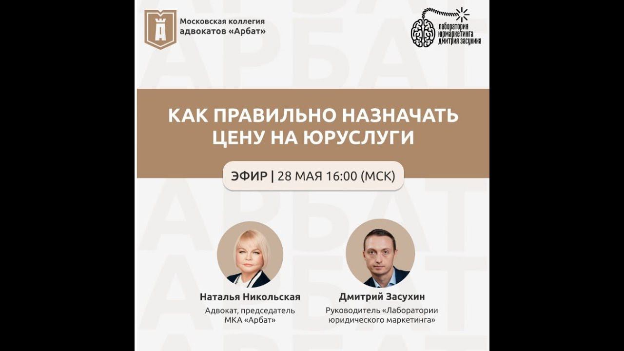 Запись прямого эфира на тему "Ценовое позиционирование. Как увеличить выручку в юрбизнесе?" Посмотрев эфир вы узнаете: ✔ Как правильно назначать цену на юруслуги? ✔ Как донести ценность своей услуги клиенту? ✔ Почему нельзя проводить бесплатные консультации? ✔ Как отрабатывать возражения клиентов «это дорого»? Приглашенный гость - Наталья Никольская, председатель МКА «Арбат», основатель конференции «Юридический бизнес России». Все об актуальных и эффективных способах привлечения клиентов на юридические услуги в нашем Telegram-канале - https://t.me/jurmarketing Делимся кейсами и опытом. Подписывайтесь, чтобы быть в курсе!