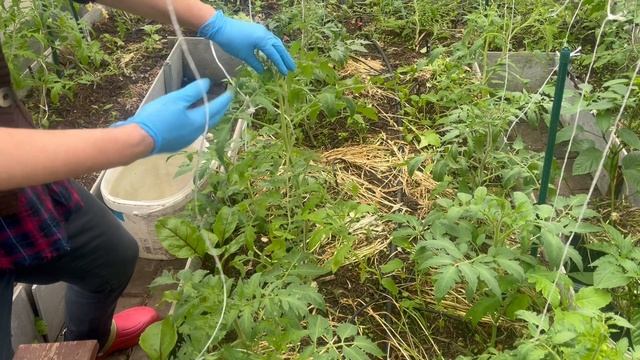 Удаляю пасынки у томатов в теплице. Подкармливаю барматухой Дзамболата.