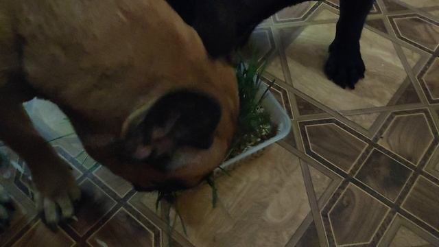 Малая (мопс), Чуча (темно-тигровая француженка) и Веня (рыжая француженка) пробуют рожь
