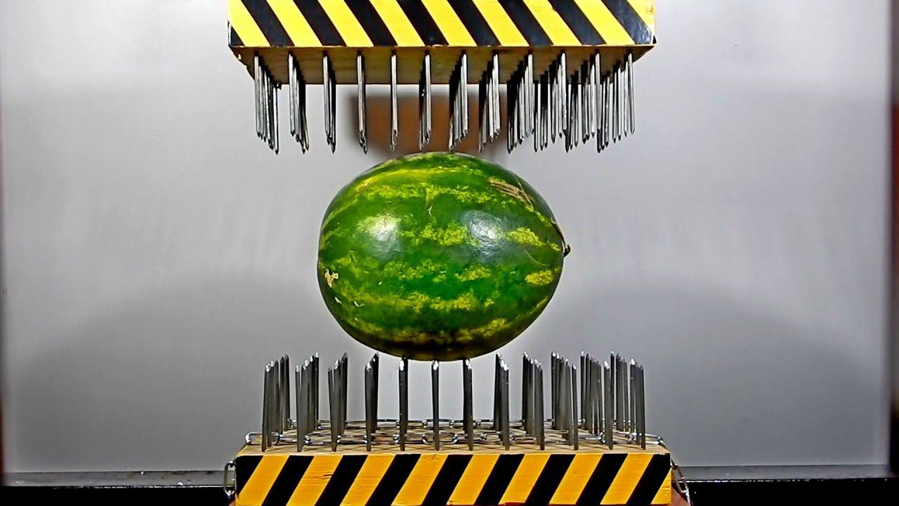 A hydraulic press with sharp surfaces destroys various objects