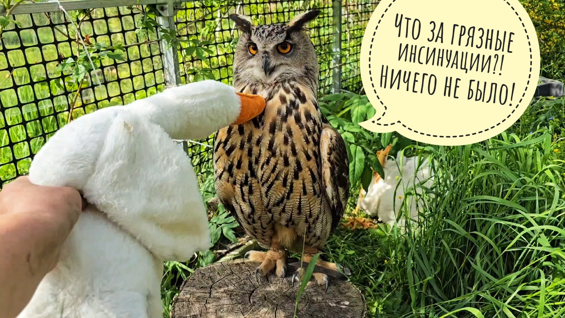 Вот так лежат подушки и гуси несколько дней нетронутыми, а потом раз - и за пять минут они распиханы по разным углам вольера, раскиданы по траве и надкусаны. Просто сова внезапно захотела суеты навести. В записи с камеры видеонаблюдения видно, как Ёль пытается подушки в дупло бревна упихать. Это сложно, но почти получилось. Ирине Александровне из @Izbushka я показываю ёлочку Биалобок - это ёлка с молодыми приростами сливочно белого цвета вместо обычного зелёного. Когда они отрастут и повзрослеют, то станут цвета всей ёлки - голубовато-зелёного. Очень нарядная весной ёлочка. Ну и формой она растрёпанная и корявенькая обычно. Как мне нравится! Артём помог мне с видео, со шлангом и сменой воды в вольере у совы. Ёль уже спокойнее реагирует на посторонних у себя в домике.