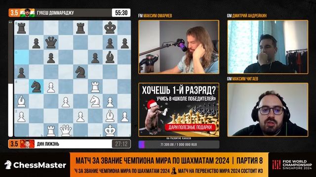Годовой курс «Школа победителей» ждёт тех, кто хочет рост рейтинга и 1-й разряд — https://bit.ly/winners-wc2024 ♔ Трансляция важнейшего события в мире шахмат - матча за звание чемпиона мира Дин - Гукеш ⏱ Начало трансляций в 12:00 МСК Игровые дни: 25-27, 29-30 ноября. 1, 3-5, 7-9, 11-12 декабря. Тай-брейк: 13 декабря. Выходные – 28 ноября. 2, 6 и 10 декабря Призовой фонд – 2,5 миллиона долларов Комментируют: GM Дмитрий Андрейкин и GM Максим Чигаев, а так же мастер FIDE Максим Омариев Донат – https://www.donationalerts.com/r/chessmaster Оперативные новости в нашем телеграм – https://t.me/ChessMaestro Обучение шахматам с кайфом – https://school.chessmaestro.ru Подписаться на канал – https://goo.gl/nY2kmn ♕ Получите книгу «21 критическая ошибка в шахматах» бесплатно – http://chessmaestro.ru/21mistakeyoutube Наши проекты – https://taplink.cc/chessmaster #ChessMaster #шахматы