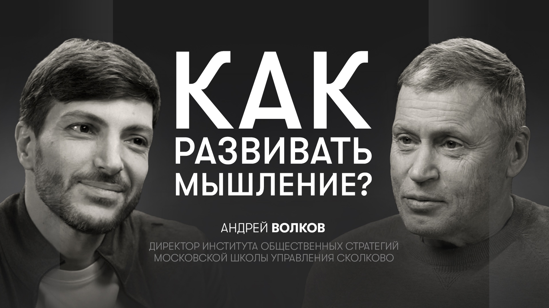 Интервью с Андреем Волковым — директором Института общественных стратегий Московской школы управления СКОЛКОВО и научным руководителем программы «Приоритет-2030» — это разговор о мышлении как основе человеческой жизни, образования и будущего. Мы обсуждаем, что первично — разум или природа, и почему мир можно понимать как единство мышления и деятельности. Андрей Волков объясняет, почему мышление возникает не «в голове», а в коммуникации, в диалоге с другими, и можно ли действительно присвоить себе мысль другого человека. Отдельный фокус — умение выходить за пределы привычных мыслительных рамок и строить проблемы, а не только решать чужие задачи. Через это мы говорим о системе образования: почему школа и университеты редко учат ставить собственные цели, каким могло бы быть образование, если бы оно развивало мышление и масштаб личности, и что становится главным в мире, где любое знание формально доступно. Значимая часть беседы посвящена целям, риску и масштабу. Зачем человеку развивающие цели, как масштаб дела «подтягивает» масштаб человека и почему успех не является главным критерием. 00:00 Тизер 01:02 Мир есть мышление и деятельность 02:00 Что первично: разум или природа? 03:00 Как формируется мышление 03:50 Как развивать мышление в коммуникации 05:20 Думающий и мыслящий 07:10 Молчание 07:20 Ограничено ли мышление языком 08:37 В чем смысл практики выхода за границы мышления 11:05 Строить проблемы 12:00 Учит ли система образования ставить цели 16:30 Если бы школа воспитывала сверхчеловека 19:10 Когда любое знание доступно, что становится важным 20:30 Как двигаться в сторону развития мышления 21:45 Отсутствие цели разрушает мышление? 23:34 Развивающие цели 28:47 Риск в мышлении 32:00 Как вырваться из коллективного мышления 32:22 Как определить масштаб человека 33:38 Успех 35:40 Человек подтягивается под масштаб дела 37:20 В чем измеряется масштаб 38:30 Уровень требований к высшим чинам 41:50 Российской образование на мировой арене 47:20 Влияет ли образование на экономику 51:28 Среднее профессиональное образование 55:58 Эзотерика 57:28 Открытость к необъяснимому 52:00 Чему учат горы 1:01:25 Вопросы, которые вы задаете себе 1:02:39 Что такое счастьеИнтервью с Андреем Волковым — директором Института общественных стратегий Московской школы управления СКОЛКОВО и научным руководителем программы «Приоритет-2030» — это разговор о мышлении как основе человеческой жизни, образования и будущего. Мы обсуждаем, что первично — разум или природа, и почему мир можно понимать как единство мышления и деятельности. Андрей Волков объясняет, почему мышление возникает не «в голове», а в коммуникации, в диалоге с другими, и можно ли действительно присвоить себе мысль другого человека. Отдельный фокус — умение выходить за пределы привычных мыслительных рамок и строить проблемы, а не только решать чужие задачи. Через это мы говорим о системе образования: почему школа и университеты редко учат ставить собственные цели, каким могло бы быть образование, если бы оно развивало мышление и масштаб личности, и что становится главным в мире, где любое знание формально доступно. Значимая часть беседы посвящена целям, риску и масштабу. Зачем человеку развивающие цели, как масштаб дела «подтягивает» масштаб человека и почему успех не является главным критерием. 00:00 Тизер 01:02 Мир есть мышление и деятельность 02:00 Что первичн
