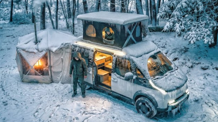 Кемпинг в снежный шторм на Kia PV5 кемпере.