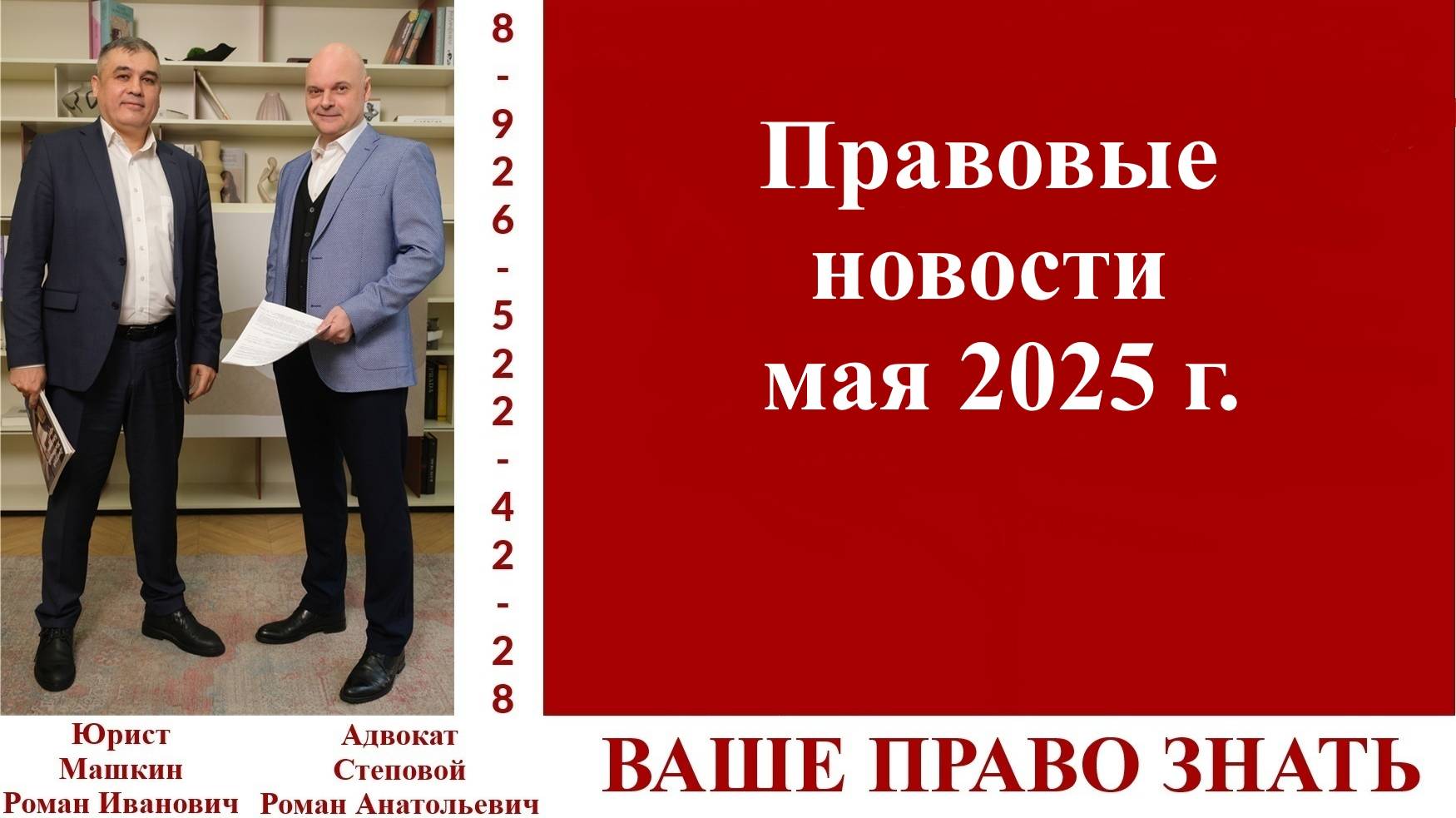 В ролике эксперт юрист Роман Иванович Машкин делает обзор новостей для зрителей канала и подписчиков. Телефон для консультаций +7-926-522-42-28 https://taplink.cc/md_rielt https://t.me/vashepravo_znat группа в Телеграмм для общения. Канал «Ваше право знать» создан для помощи гражданам в решении их юридических и не только вопросов. В форме кратких консультаций эксперты канала доступно рассказывают о возможных путях выхода из сложных правовых ситуаций. Основной целью канала является оказание аудитории юридических услуг и повышение правовой грамотности населения. Эксперты канала простым и понятным языком рассказывают о практической юриспруденции на конкретных примерах. Подписывайтесь на наш канал, обращайтесь с вопросами и за помощью. Мы найдем время для каждого. ЭКСПЕРТЫ: Машкин Роман Иванович, практикующий юрист со стажем 23 года, 2 Высших образования: Ставропольское ВАИУ (первые два года СВАУЛШ): штурманский факультет, Инженер по управлению воздушным движением. В 2000 году Военный Университет МО РФ, юрисконсультский факультет, юрист. Начальник юридической группы в МО РФ, Помощник начальника Управления по правовой работе-начальник правового управления в Управлении по использованию воздушного пространства РФ, генеральный директор и учредитель Юридической компании и Агентства Недвижимости «МД-Недвижимость», член совета директоров Холдинга «Моя Семья». Правовое сопровождение телевизионных проектов Дом-2, Суд Идет, Машина, Мама в Законе, международных телевизионных проектов. Являлся экспертом в телевизионных программах на телеканалах ТНТ, МИР, ТВЦ, участник круглых столов ТПП, Госдуме РФ, участник конференций, проводимых Минстроем России, член школы переговоров Игоря Рызова, состоит в деловом клубе Екатерины Уколовой. Правовое сопровождение компаний и ИП, представительство в Арбитражных судах и судах общей юрисдикции по вопросам налогового права, гражданского права, международного права. Банкротство юридических лиц. Семейное право. Сопровождение сделок с недвижимостью в РФ и за рубежом. Степовой Роман Анатольевич, адвокат, руководитель адвокатского кабинета. С 2002 года успешно осуществляет адвокатскую деятельность по представлению интересов и защите прав граждан и юридических лиц. С 2000 по 2019 года преподавал на юридическом факультете Московского государственного областного университета, (ныне Государственный университет просвещения), дисциплины гражданско-правового и государственно-правового профиля. Автор многочисленных публикаций по вопросам прикладной юриспруденции. В работе с клиентами придерживается принципов порядочности и профессионализма. В любой ситуации ищет оптимальную модель правового поведения и минимизирует потери клиента. Основную задачу видит в осуществлении реальной помощи доверителям и подзащитным. В общении с клиентами максимально честен. Майор юстиции запаса. Телефон для консультаций +7-926-522-42-28 Смотрите нас где удобно https://t.me/vashe_pravo_znat Телеграмм канал проекта "Ваше право знать." https://t.me/vashepravo_znat группа в Телеграмм для общения. https://www.youtube.com/@user-ki6nr6zh3p канал Ваше право знать на Ютюб https://rutube.ru/channel/30527736/ канал Ваше право знать на Рутюб https://vk.com/public219361576 сообщество во Вконтакте https://www.youtube.com/@user-zt2rt7vh1m канал Ютюб адвоката Романа Степового https://md-rielt.ru/ сайт МД-Недвижимость https://степовой.рф сайт адвоката Степового Романа Анатолье