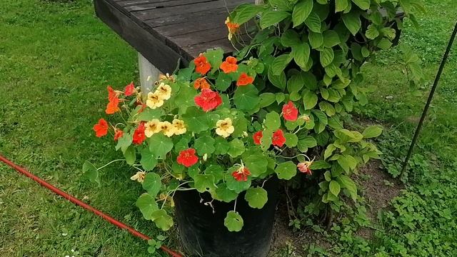 Настурции (Tropaeolum) в бочке под колодцем. Лето 2023