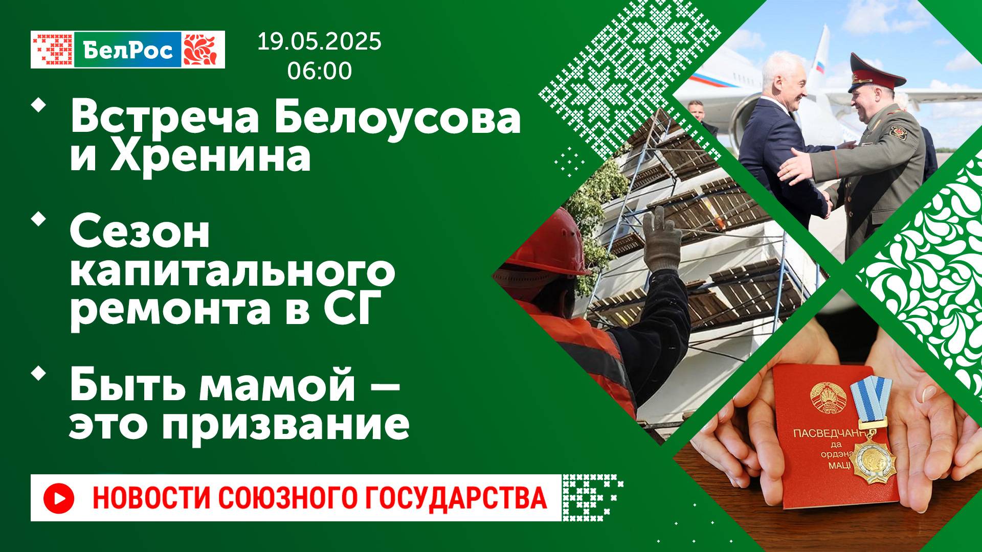 Закадровый текст озвучивает *ИИ Антон* Новости 19.05.2025 на 06:00 - Министры обороны России и Беларуси провели рабочую встречу в Минске. - Правительство выделило на IT-ипотеку дополнительно 61 миллиард рублей. - В Москве и Минске стартовал новый сезон капитального ремонта. - Гродненская детская больница впервые занесена на Республиканскую доску почёта. - В Минске наградили многодетных женщин Орденом Матери. - Единый день Информирования прошёл в "Зубрёнке". Смотрите главные новости Союзного государства на телеканале БелРос. Ссылки на наши соц. сети Сайт: http://belros.tv/ Telegram: https://t.me/belrostv Одноклассники: https://ok.ru/group/55657426976918 ВКонтакте: https://vk.com/belrostv TikTok: https://www.tiktok.com/@belros_tv?_t=... RuTube: https://rutube.ru/channel/23501830/ Яндекс. Дзен: https://zen.yandex.ru/belrostvv Наши подкасты на Яндекс. Музыке: https://music.yandex.ru/album/25615251 #главныеновости #новостисегодня #СоюзноеГосударство