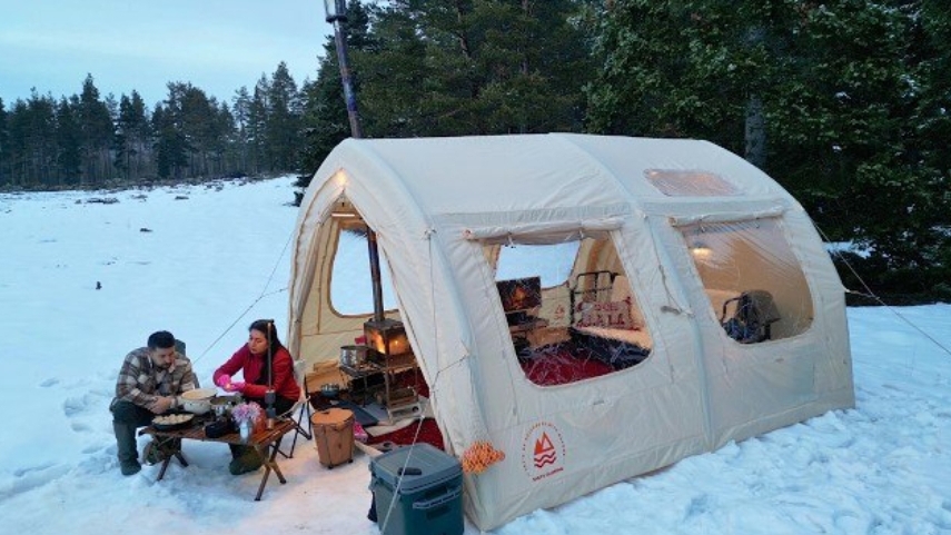 Кемпинг в заснеженном лесу, с надувной палаткой.