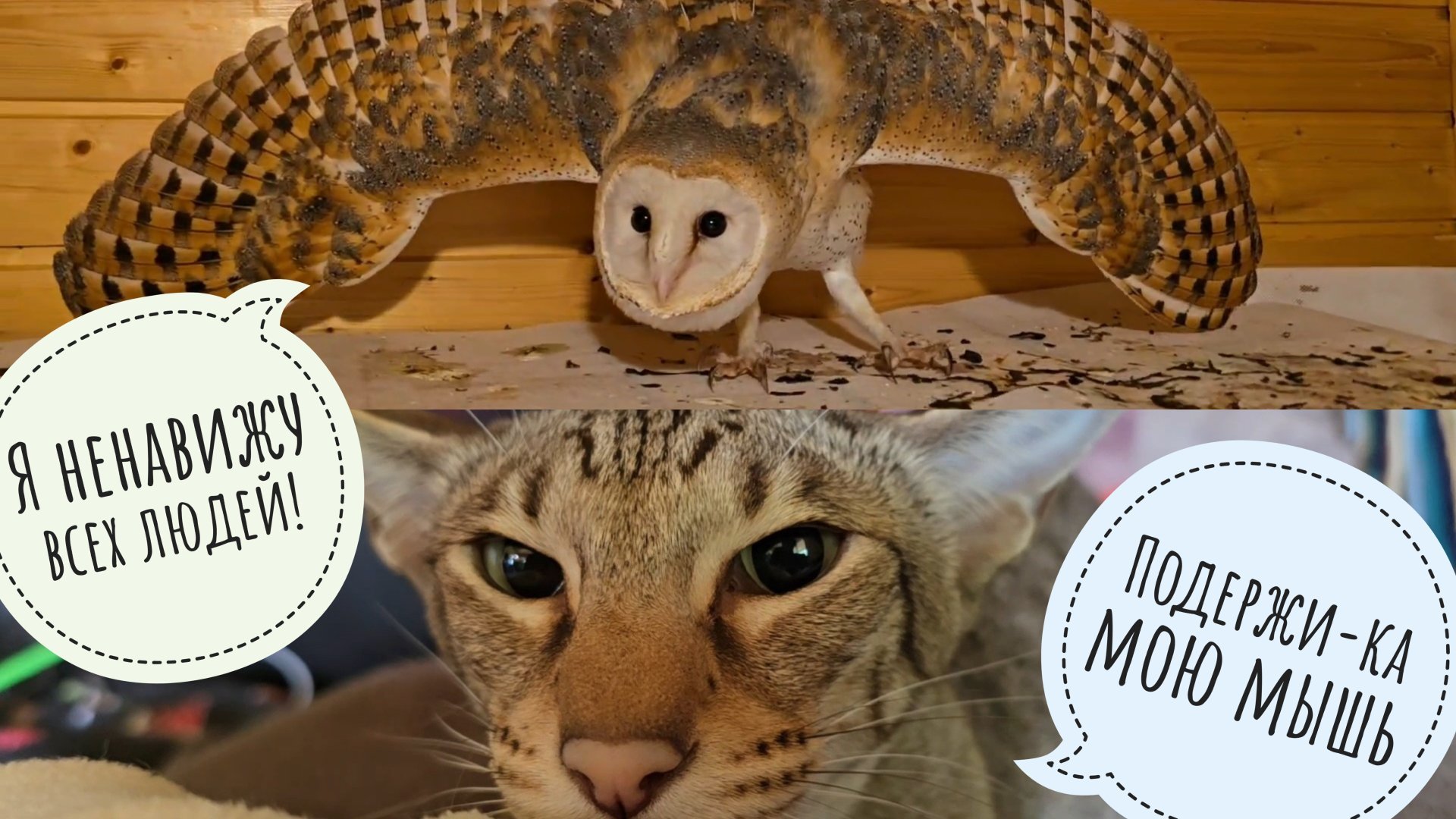 Видео из кучки кусочков за два дня. Их просто надо показать, а то потом будет видео про сову в люпинах, Рептилиум, что-то ещё и вообще. Кошку Морошку в канаве я нашла вчера. Ей там просто нравится. А сегодня она половину дня сидит-лежит под домом и не хочет выходить. Ещё кошка показала всем, какая крутая у неё есть тачка, а треугольный кот Марсель вообще озвучил что-то на рейтинг 18+. Сова сипуха Пухня от нас скоро уедет, а за эти почти два месяца я её почти и не видела. Вот и наснимали контенту с неправильной совой!