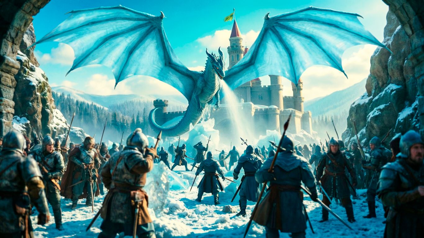 В этом ролике вы увидите яркий солнечный зимний день в северной гористой местности, где разворачивается эпическая осада замка. На фоне снежных вершин виднеется мистический замок. В центре изображения могущественный ледяной дракон вступает в бой с напавшими на замок воинами. Он использует своё смертоносное ледяное дыхание дракона против нападающих. Воины, попавшие под струю холода, мгновенно превращаются в ледяные статуи. Остальные участники сражения испытывают панический ужас перед магической мощью защитника крепости. #ЛедянойДракон #ЛедяноеДыханиеДракона #ЗамороженныеВоины #ОсадаМистическогоЗамка