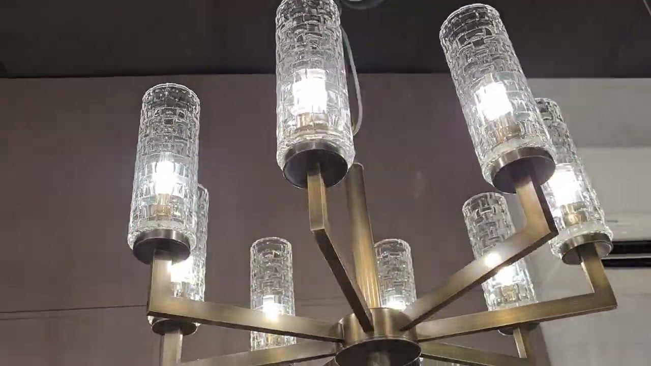 Люстра подвесная, каракас в цвете латуни, строгие цилиндрические плафоны из стекла.