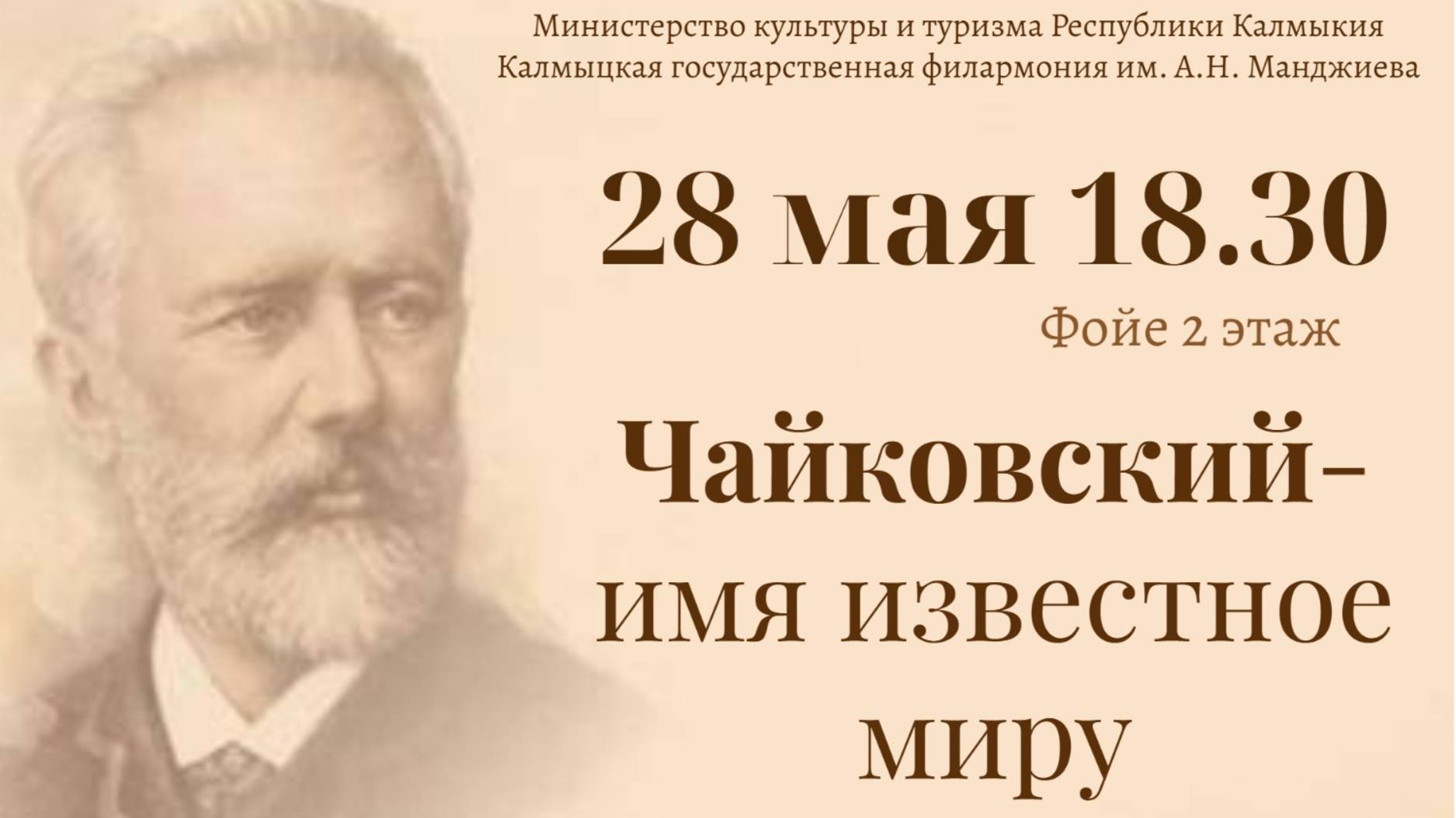 Концерт солистов и творческих коллективов Калмыцкой государственной филармонии имени Аркадия Манджиева «Чайковский – имя, известное миру». В концерте прозвучали духовные и инструментальные сочинения, фрагменты из опер и балетов, романсы Петра Чайковского. В концерте принимали участие: Государственный хор Республики Калмыкия имени А.О.-Г.Цебекова (художественный руководитель и главный дирижер - заслуженный деятель искусств РК Ольга Сердюкова), Государственный симфонический оркестр Республики Калмыкия (художественный руководитель и главный дирижер - заслуженный деятель искусств РК Мерген Настинов), солисты - Заслуженная артистка РК Анна Очкаева, Заслуженная артистка РК Татьяна Адьянова, Заслуженная артистка РК Наталья Черникова, Заслуженный артист РК Лиджи Горяев, Лауреат Премии Главы РК Лиджи Доржинов, Наталья Гришкина, Данзан Зулаев, Бадма Баджаев.