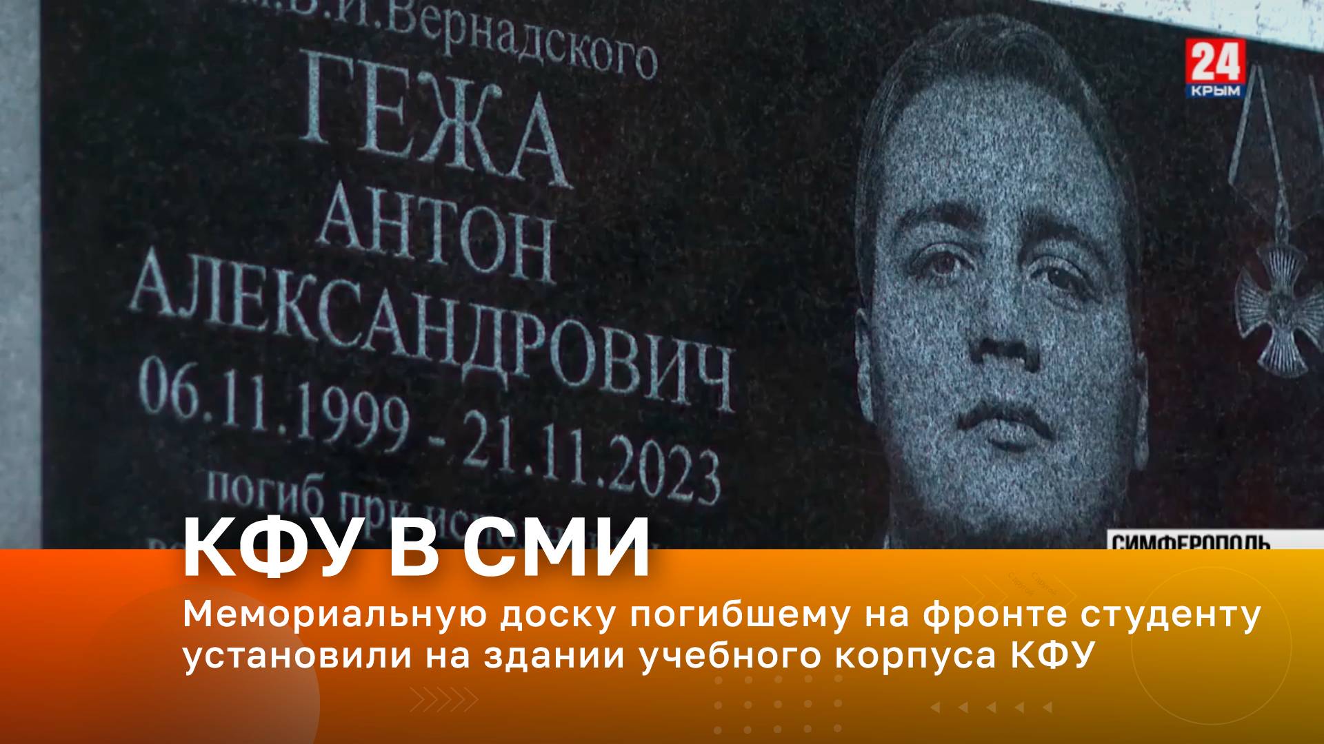 Телеканал «Крым 24». В эфире – директор ИММиД КФУ им. В.И. Вернадского Александр Мащенко, студентка ИММиД КФУ Злата Прозор, заместитель директора по науке ИММиД КФУ Диана Первых. Тема эфира – Мемориальную доску погибшему на фронте студенту установили на здании учебного корпуса КФУ в ботаническом саду.