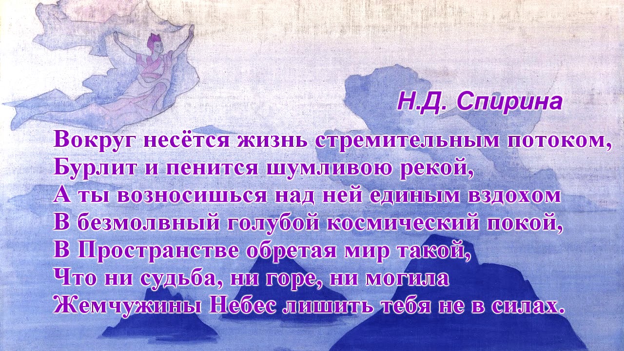 Наталия Спирина * * * Вокруг несётся жизнь стремительным потоком, Бурлит и пенится шумливою рекой, А ты возносишься над ней единым вздохом В безмолвный голубой космический покой, В Пространстве обретая мир такой, Что ни судьба, ни горе, ни могила Жемчужины Небес лишить тебя не в силах. 20.01.1958 г. Читает автор. #НаталияСпирина, #ПоэзияНовойЭпохи, #ПоэзияСпириной -------------------------------------------- О Наталии Дмитриевне Спириной: Сайт, посвященный Н.Д. Спириной: https://spirina.info Раздел на сайте СибРО: http://sibro.ru/teacher/spirina/ Instagram: https://www.instagram.com/nataliya.spirina/ Telegram: https://t.me/SpirinaN видеофильмы: https://www.youtube.com/playlist?list=PLRDwJtqWLAx7zdjQRW1u5QSUW3T6SJ4rj -------------------------------------------- Помочь проектам СибРО: https://sibro.ru/dari-dobro/ Благодарим наших постоянных помощников! -------------------------------------------- Канал Сибирского Рериховского Общества и Музея Николая Рериха в Новосибирске https://www.youtube.com/channel/UCOy_IPfEW_uKJU7lY6HwEaA Канал Трансляции СибРО https://www.youtube.com/channel/UCtl9xwOporefIWfINDnFlKQ Сайт: https://sibro.ru Группы: VK https://vk.com/roerichmuseumnsk OK https://ok.ru/roerichmuseum FB https://facebook.com/roerichmuseumnsk IG https://instagram.com/roerich_museum_novosibirsk/ Книги издательства СибРО "РОССАЗИЯ": https://rossasia.sibro.ru/knigi/ Интернет-магазин "Искры Света": https://knigisibro.ru