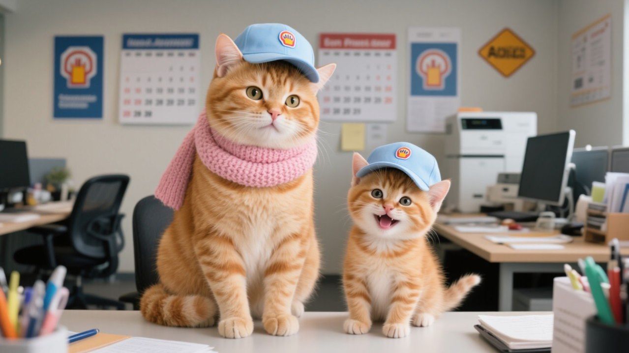 Котёнок в шапочке надевает рабочую кепку, чтобы заправиться, и останавливает водителя от курения