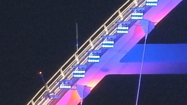 Арки Крымского моста в новой подсветке.Красивейшее зрелище!Движение поездов по вечернему мосту!