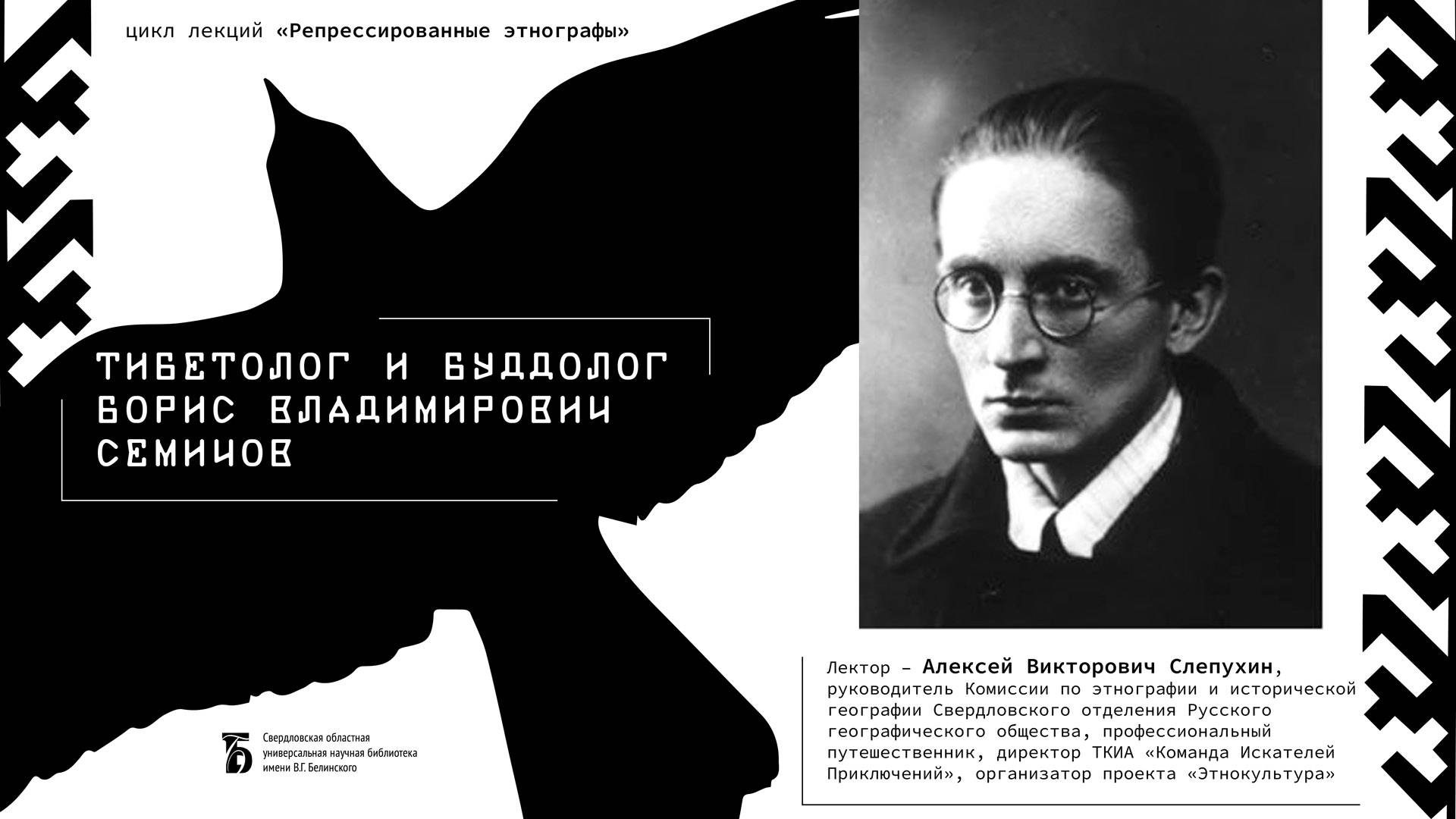 Лекция из цикла «Репрессированные этнографы» Лектор – Алексей Викторович Слепухин, руководитель комиссии по этнографии и исторической географии Свердловского отделения Русского географического общества, профессиональный путешественник, директор ТКИА «Команда Искателей Приключений», организатор проекта «Этнокультура». Лекция состоялась в 2023 г. Свердловская областная универсальная научная библиотека им. Белинского http://book.uraic.ru/ сайт https://vk.com/club6745014 VK