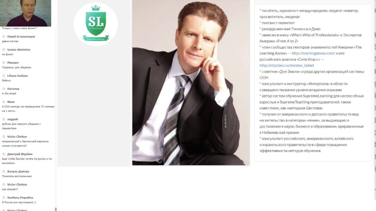Мастер-класс Михаила Шестова от 01.11.2017 По этой причине реальный интеллигентный английский не учится обычными способами. «Русский медведь» - это русские звуки в английском языке. Это так же нелепо, как пробовать собрать «форд» из запчастей от «жигулей»! Но именно этим занимаются практически все “клоуны”-преподаватели английского. Михаил Шестов покажет вам, как на самом деле читаются английские слова отдельно и в составе предложений. Михаил Шестов - полиглот, автор уникального метода изучения иностранных языков. http://supremelearning.ru Если вам нужен английский (не в странной форме в виде рунглиша (врунглиша), а General English), то Дистанционный курс - самый быстрый способ, чтобы освоить язык в короткие сроки. http://www.supremelearning.net/distance/