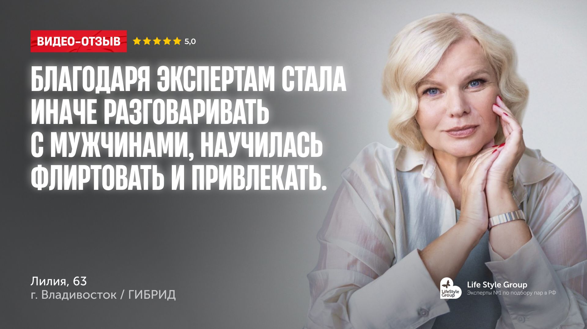 Я искренне верю, что вы из первых – записывайтесь на диагностику, там разберетесь куда двигаться дальше: https://vk.com/app6013442_-59013708?form_id=316#form_id=316 Мы ВК - https://vk.com/ma.lifestylegroup Друзья, всем добрый день. На связи Елена Панюшкина и новый отзыв от одной из наших клиенток. Весь отзыв в моей голове звучала песня «Ах, какая женщина, какая женщина». Клиентке 63 года, при этом она выглядит настолько эффектно, что я даже накрасила губы перед встречей с ней, чтобы не быть на ее фоне серой мышкой. Лилия в работе уже долго, начинала с пакета ГИБРИД, затем поняла, что и среди кандидатов ВИП есть достойные и интересные мужчины, собственно и в итоге продлевает договор сейчас на ВИП – кстати, абсолютно частая и нормальная практика. Сложная возрастная категория, сложный регион и неуемное твердое желание Лилии идти до конца, привели к невероятным трансформациям. За время работы она научилась общаться с мужчинами правильно, флиртовать, где-то лукавить как лиса, получила массу комплиментов и эмоций. В процессе подбора были разные кейсы – где-то неудачные, где-то удачные, но все это это Лилия воспринимает с такой легкостью и позитивом, сохраняя свою твердую уверенность совершить столько попыток, сколько потребуется. Отдельно она отметила фотосессию, которую мы для нее организовали, и после которой она влюбилась в себя заново (она и все ее знакомые, родственники, когда увидели новые аватарки в соц.сетях), насколько ей было легко в процессе, т.к. профессионально организовано. Отдельные благодарности: Оксане Жиделевой – эксперту сопровождения и куратору отдела Продукта. Отдельно хочу выделить инсайты Лилии еще на старте, когда Оксана в свойственном ей стиле аккуратно, но твердо разрушила ее мнение о том, какие же нужны фото и как она благодарна ей за это. А также за помощь и поддержку на протяжении всей работы, при чем ненавязчивую, но постоянную. Ангелине Горшковой – эксперту по подобру. За то, что помогала подбирать пакет и определяться, куда двигаться дальше и с каким количеством кандидатов. Татьяне Бокаревой и Марии Гудковой – экспертам удаленного поиска. Именно благодаря им Лилия смогла вспомнить, что такое общение с реально подходящими ей достойными мужчинами. Тайм-коды: 01:25 – история Лилии до встречи с нами... 02:47 – почему решили немного занизить возраст клиенту в анкете? 03:57 – какие были самостоятельные попытки найти партнера? 08:03 – как происходило сотрудничество? 11:56 – я прислала эксперту свои фотографии... И получила очень ДЕЛИКАТНЫЙ УРОК 14:51 – какие были кандидаты и как с ними шло общение? И почему мужчины даже не читают анкеты? 18:20 – рекомендации Лилии для тех, кто сейчас в поиске пары Всем, кто в поиске Лилия желает идти, пробовать, делать и готовиться к тому, что это будет в долгую, т.к. хорошие кандидаты на дороге не валяются хороших кандидатов надо долго и усердно искать. А меня лично очень зацепила ее фраза: "Я поняла, что еще могу сделать чью-то жизнь счастливой." Какая здесь теплота и сила одновременно: я не закрываю свои дефициты, а хочу сделать кого-то счастливым. И даже во время записи отзыва как бы она не старалась быть серьезной, ее фонтанирующая солнечная энергия прорывалась наружу. Знаете, что в конечном счете отличает того, у кого получилось найти пару, от тех, у кого – не получилось? Просто первые действуют, а вторые просто читают чужие отзывы.