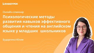 Онлайн-семинар Ведущая: Бударгина Юлия. Преподаватель психологии и автор обучающих курсов, спикер конференций. ____________________________________ Английский язык является универсальным языком мира. На данный момент в большинстве школ английский язык начинают изучать со 2 класса. Психологические особенности младших школьников сильно отличаются от детей постарше, поэтому и процесс обучения нужно выстраивать, учитывая эти различия. Понимание психологии младших школьников поможет существенно повысить эффективность образовательного процесса. Задача преподавателей и родителей помочь наладить эффективный и комфортный процесс обучения английскому языку младших школьников. © Издатель: Проект «Инфоурок»