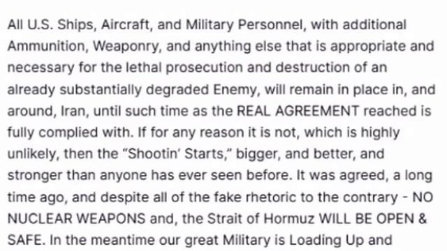 ‼️🇺🇸🇮🇷 Американские силы останутся вокруг Ирана до достижения окончательного соглашения, — Трамп ▪️США сохраняют на месте корабли, авиацию и военных с дополнительными боеприпасами и вооружением, "необходимыми для нанесения смертельных ударов и уничтожения уже существенно ослабленного противника". ▪️Он добавил, что если соглашение не будет заключено, то США начнут еще более масштабные удары. ▪️Трамп также подчеркнул, что "ядерного оружия не будет", а Ормузский пролив "будет открыт и безопасен", добавив, что американские силы "пополняют запасы и отдыхают" и "уже с нетерпением ждут следующего завоевания".