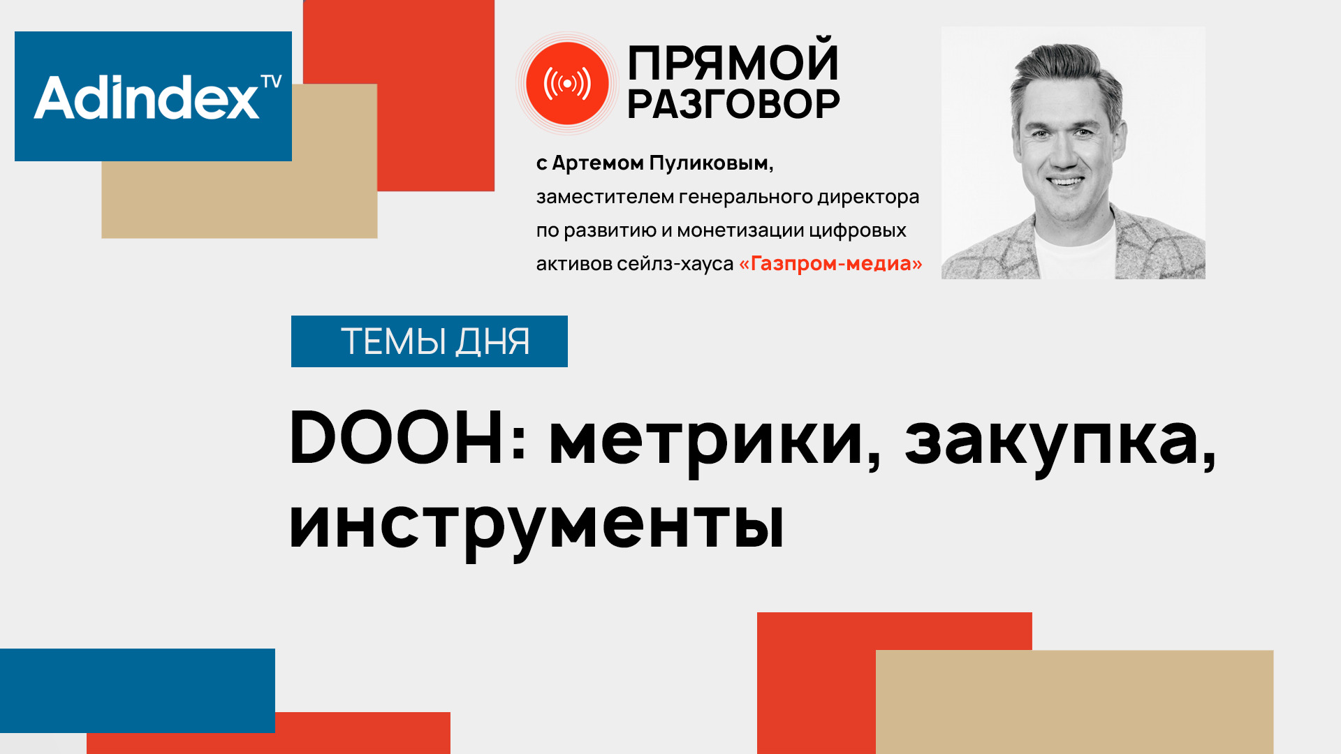 В каждом выпуске эксперты продолжают повторять: DOOH драйвит этот рынок. Однако цифровая наружная реклама сегодня – это не только диджитал-конструкции, но и новые способы закупки инвентаря и возможности для омниканальности. Об уникальные возможностях programmatic-закупки и развитии dsp-платформ — поговорим в новом специальном выпуске «Прямой разговор. ООН» Гость эфира: - Артем Пуликов, заместитель генерального директора по развитию и монетизации цифровых активов сейлз-хауса «Газпром-медиа» «Прямой разговор» выходит в прямом эфире каждую среду и пятницу в 12:00. Если вы хотите стать гостем нашей программы, предложить тему для выпуска или задать вопрос гостям, пишите в наш телеграм-бот: @AdIndex_news_bot Подписывайтесь на телеграм-канал для оперативных новостей https://t.me/adindex_live Adindex во «ВКонтакте»: https://vk.com/adindex Adindex в Одноклассниках: https://ok.ru/adindex.ru *В эфире могут упоминаться социальные сети Instagram и Facebook — организации признаны экстремистскими и запрещены на территории Российской Федерации.