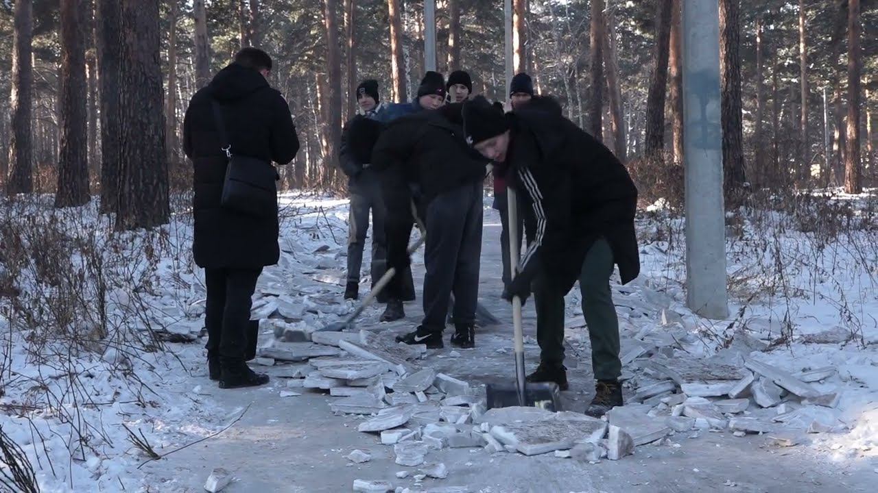 Борьба со снегом продолжается. На очистку тропинок городской рощи вышли молодые активисты.