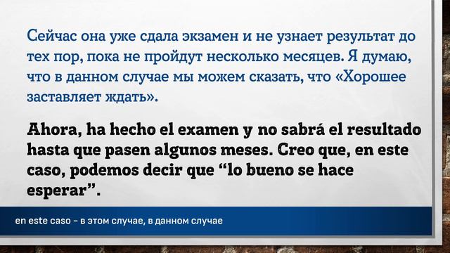 Урок основан на эпизоде подкаста взятом на сайте https://www.spanishpodcast.net Полная ссылка на эпизод подкаста с транскрипцией: https://www.spanishpodcast.net/lo-bueno-se-hace-esperar/ Полная ссылка на аудио файл эпизода: https://ia801704.us.archive.org/22/items/xqwwwepsixchhczxz4443iwspesp/xqwwwepsixchhczxz4443iwspesp.mp3?_=1 Данный материал предназначен исключительно в образовательных целях. Данный материал частично был синтезирован с помощью искусственного интелекта. Цель – заставить мышление учащегося формировать фразы, части фраз, на испанском языке. Каждая фраза повторяется три раза. Повторения происходит не подряд, а с некоторым "смещением", заставляя всё время мысленно переключаться на другую фразу. Пауза между фразами служит для того, чтобы вспомнить хотя бы одно слово, часть фразы или всю фразу на испанском языке. Чем длиннее фраза на русском языке – тем длиннее пауза до фразы на испанском языке. Достаточно, если человек самостоятельно начинает формировать хотя бы кусочки фразы, некоторые слова. Данный вид упражнений не стоит делать более одного часа за один раз. Использйте для обучения только тот материал, который Вы понимаете на 90%-95%! Достаточно прослушивать такие упражнения в фоновом режиме: замимаясь домашними делами, находясь в дороге или на прогулке, занимаясь спортом. Чтобы выучить любой язык необходимо «провести с ним» 10 000 часов. #испанский #испания #слова #фразы #aprender #español #españa #español #испанскийязык #испанскийбесплатно #испанскийэффективно #учимиспанский #испанскийучить #shadowing #ShadowingTechnique #Lerntechnik #произношение #грамматика #subjuntiv #expresiones #shadowingmethode #эффективно #españolonline #españoloffline #aprenderespanolonline #pimsleur #paulpimsleur Слова и выражения из этой части подкаста: ================================================ "El que espera, desespera!" - (дословно) Тот кто ждёт, впадает в отчаяние “lo bueno se hace esperar” - «Хорошее заставляет ждать» (Русск.: «Терпение и труд всё перетрут») aprobar el examen - сдавать экзамен contenta - рада, счастлива cuando antes - чем быстрее, как можно раньше de momento desesperar - отчаиваться, терять голову el científico - учёный, исследователь en este caso - в этом случае, в данном случае esforzarse - стараться, напрягаться la impaciencia - нетерпеливость, несдержанность la recompensa - награда, вознаграждения, компенсация la vacuna - прививка los médicos - врачи recompensado - вознаграждаются, окупаются seguro que... - уверен, что..., наверняка un familiar - некий родственник, член семьи una persona muy querida - некий любимый, дорогой человек
