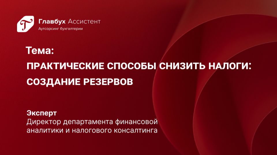 Практические способы снизить налоги. Создание резервов Наш сайт: https://gba.business.ru/ ВК: https://vk.com/gbaguru Телеграм: https://t.me/businessololo Одноклассники: https://ok.ru/group/57882963738625 Главбух Ассистент - лидер отрасли бухгалтерского аутсорсинга. Входит в группу Актион, входит в ТОП крупнейших компаний в области аутсорсинга учетных функций рейтинга RAEX. С вами будет работать команда из нескольких сертифицированных специалистов: главный бухгалтер, кадровик, бухгалтер по расчету ЗП и юрист. Бухгалтерское обслуживание во всех городах России. Эксперты-лидеры отрасли возьмут на себя бухгалтерский, кадровый и налоговый учет.