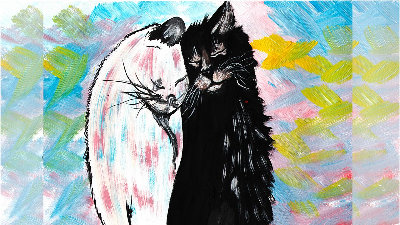 Как нарисовать влюбленных котов. Рисуем котов гуашью. Правополушарное рисование. Кот и кошка.
