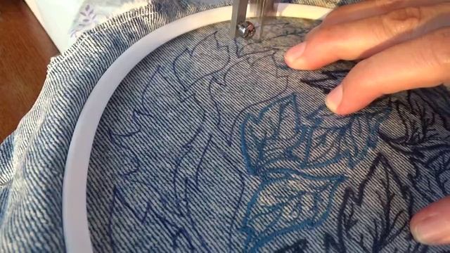 Наталья Московских (Кондратьева) вышивает на машинке листья из джинсовой ткани для панно.