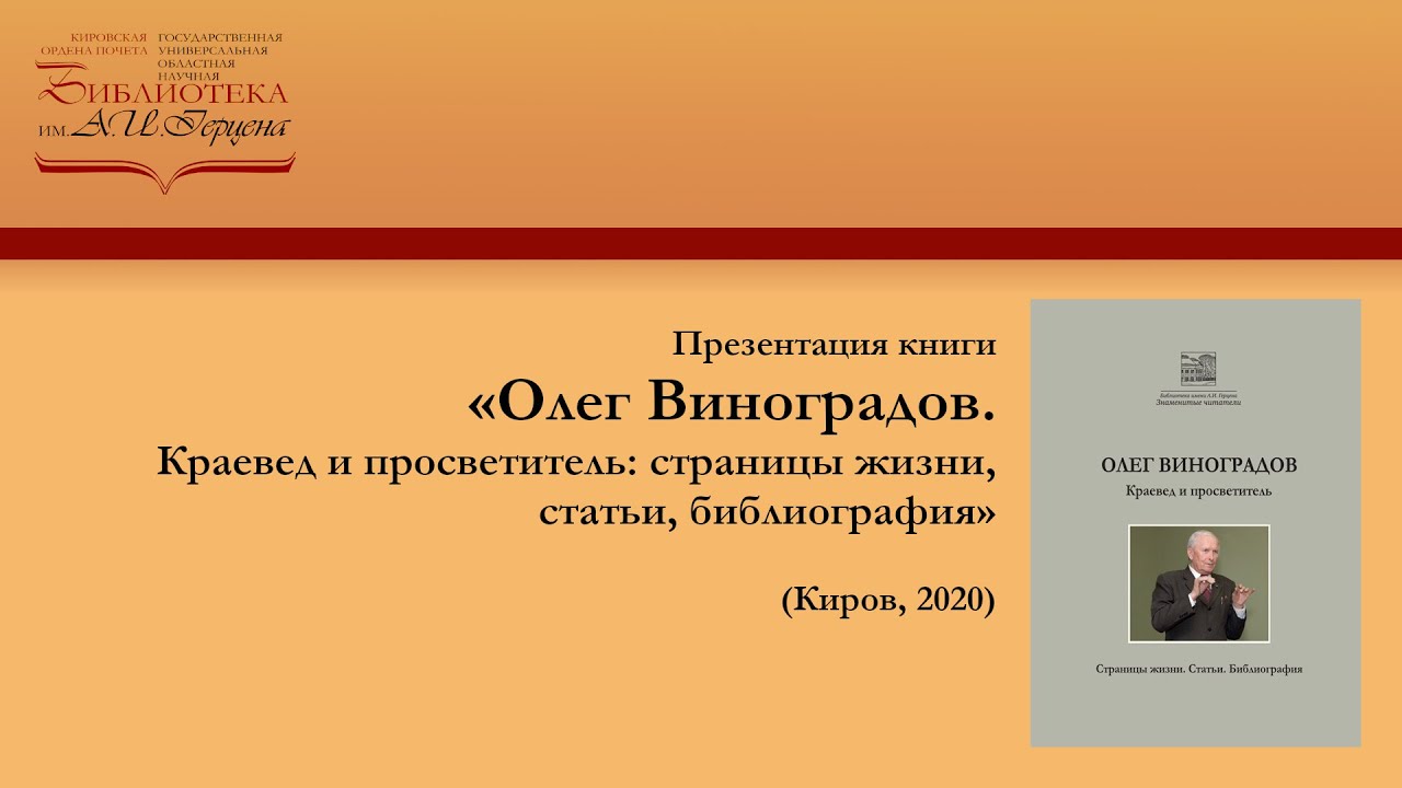 Книга посвящена известному вятскому краеведу Олегу Николаевичу Виноградову (1929–2018). Опубликованные материалы раскрывают основные этапы его жизни, тематику и содержание исследовательской работы. Ответственный редактор издания Павел Шарабаров и сын Олега Николаевича о. Евгений Виноградов рассказали о герое книги и о тех материалах, которые вошли в юбилейный сборник. Книга будет интересна широкому кругу читателей – историкам, краеведам, студентам и всем, кто интересуется прошлым родного края. (материал от 30 сент. 2020 г.)
