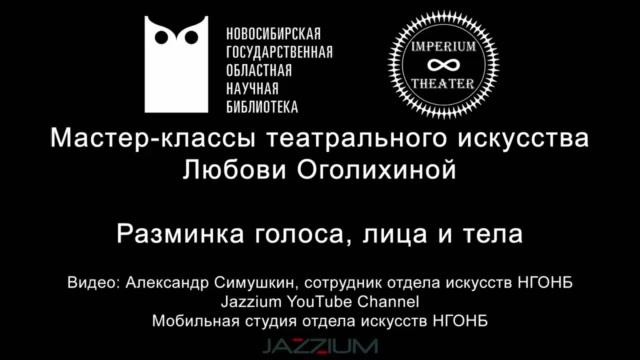 НГОНБ 2020-08-14 Отдел искусств Новосибирской государственной областной научной библиотеки представляет проект «Мастер-классы театрального искусства Любови Оголихиной» «Сила воздействия на зрителя заложена в умении раскрепостить все свое тело.» К. С. Станиславский Актёрское мастерство важно для любого, кто так или иначе выступает перед публикой. Разминка — необходимая часть любого публичного выступления, будь то игра на сцене или же произнесение речи перед аудиторией. Этот мастер-класс расскажет о том, как правильно разминать мышцы лица и тела, как управлять своим дыханием, как подготовить свой голос к выступлению. Видео: Симушкин Александр (Jazzium YouTube Channel), Обанина Дарья Монтаж: Оголихина Любовь Ведущая: Оголихина Любовь, художественный руководитель молодёжного театра "Imperium theater"
