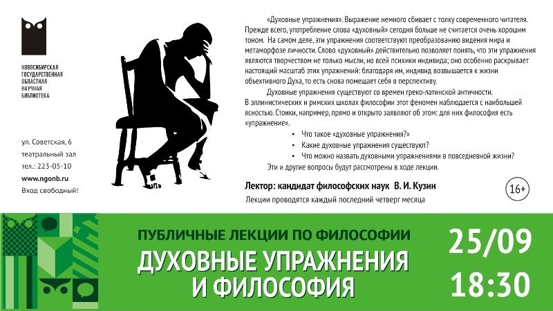 НГОНБ 2014-09-25 «Духовные упражнения» — выражение немного сбивает с толку современного читателя. Прежде всего, употребление слова «духовный» сегодня больше не считается очень хорошим тоном. На самом деле, эти упражнения соответствуют преобразованию видения мира и метаморфозе личности. Слово «духовный» действительно позволяет понять, что эти упражнения являются творчеством не только мысли, но всей психики индивида; оно особенно раскрывает настоящий масштаб этих упражнений: благодаря им, индивид возвышается к жизни объективного Духа, то есть снова помещает себя в перспективу. Духовные упражнения существуют со времен греко-латинской античности. В эллинистических и римских школах философии этот феномен наблюдается с наибольшей ясностью. Стоики, например, прямо и открыто заявляют об этом: для них философия есть «упражнение». • Что такое «духовные упражнения?» • Какие духовные упражнения существуют? • Что можно назвать духовными упражнениями в повседневной жизни? Лектор: Василий Иванович Кузин, кандидат философских наук. Открытые лекции по философии проводятся в Новосибирской областной научной библиотеке с 2011 года и пользуются большой популярностью у жителей города, прежде всего молодёжи. Полный цикл лекций можно посмотреть на канале Новосибирской государственной областной научной библиотеки в плейлисте «Публичные лекции по философии» — https://rutube.ru/plst/72357. Подробнее об этом проекте можно узнать на сайте Новосибирской областной научной библиотеки: http://www.ngonb.ru/.