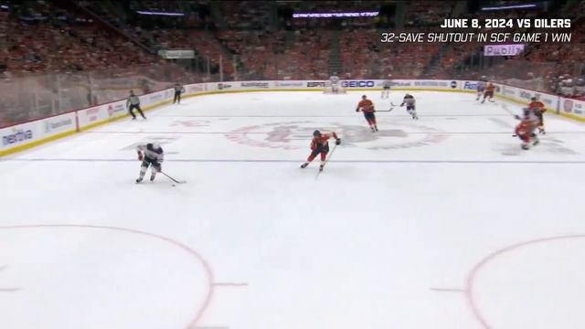10 - 3/31/22: 37-save shutout in 4-0 win vs. Chicago Blackhawks 9 - 2/10/24: 34-save shutout in 4-0 win vs. Colorado Avalanche 8 - 1/20/22: 40-save shutout in 6-0 win at Edmonton 7 - 10/13/22: 32 saves (14 high-danger) in 3-1 win at New York Islanders 6 - 5/22/24 (Game 1 of 24 ECF): 24-save shutout in 3-0 win at New York Rangers … 3.25 goals saved above expected. 5- 1/4/22: 47 saves (17 high-danger) in 6-2 win vs. Calgary Flames … 3.28 goals saved above expected 4- 6/8/24 (Game 1 of 24 SCF): 32-save shutout in 3-0 win vs. Edmonton Oilers … 3.74 goals saved above expected 3- 4/26/23 (Game 5 of 23 1st Round): 44 saves in 4-3 OT win at Boston Bruins … Series-saving stop on Brad Marchand at end of 3rd period 2- 5/18/23 (Game 1 of 23 ECF): 63 saves in 3-2 4OT win at Carolina Hurricanes … 5.22 goals saved above expected 1 - 6/24/24 (Game 7 of 24 SCF): 23 saves in 2-1 win vs. Edmonton Oilers to win Stanley Cup. Stay connected with the #FloridaPanthers: Subscribe https://www.youtube.com/@flapanthers?sub_confirmation=1 Instagram https://www.instagram.com/flapanthers/ TikTok https://www.tiktok.com/@flapanthers Twitter https://twitter.com/flapanthers Facebook https://www.facebook.com/flapanthers Website https://www.floridapanthers.com