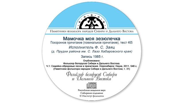 Похоронное причитание (поминальное причитание), текст 465. Исполнитель Ф. С. Заяц (д. Прудки района им. С. Лазо Хабаровского края). Запись 1985 г. Опубликовано: Фольклор белорусов Сибири и Дальнего Востока. Ч. 1: Семейно-обрядовые песни и причитания. Новосибирск: Наука, 2011. 548 с. (Памятники фольклора народов Сибири и Дальнего Востока; Т. 31)